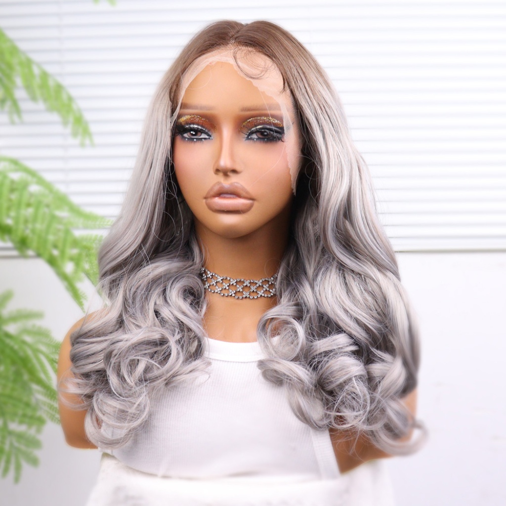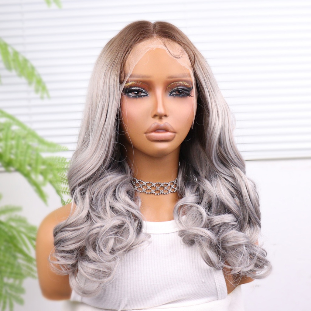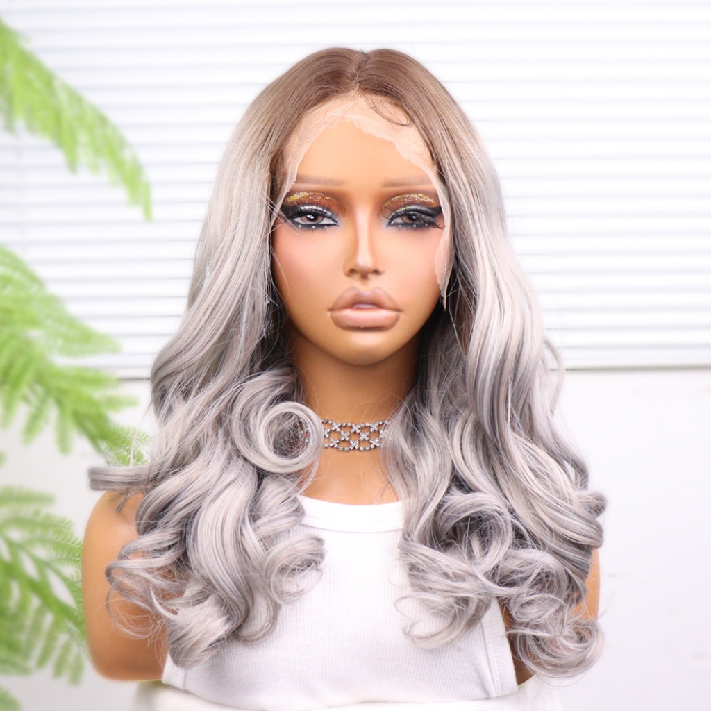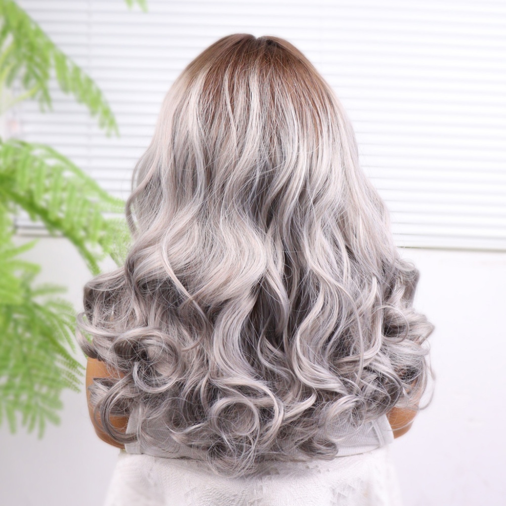 Açık Kumral Gri Ombreli Bebek Saçlı Geniş Dalgalı Fiber Sentetik Tül Peruk