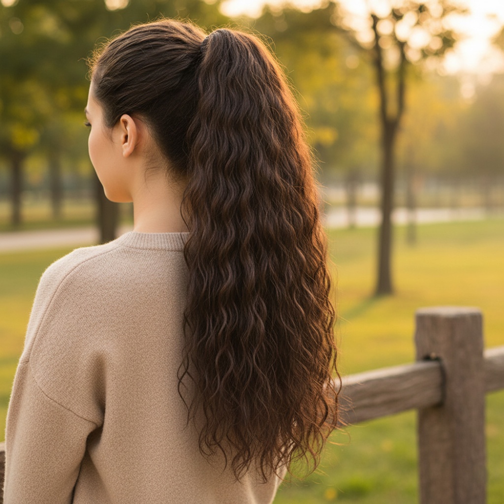 Bağlamalı Kabarık Dalgalı At Kuyruğu - Kahve Karamel