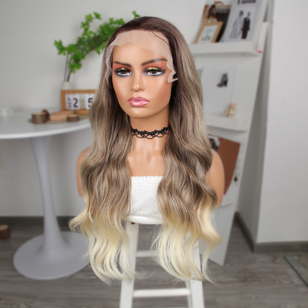 Bebek Kumralı Platin Ombre ve Röfleli Fiber Sentetik Geniş Dalgalı Tül Peruk