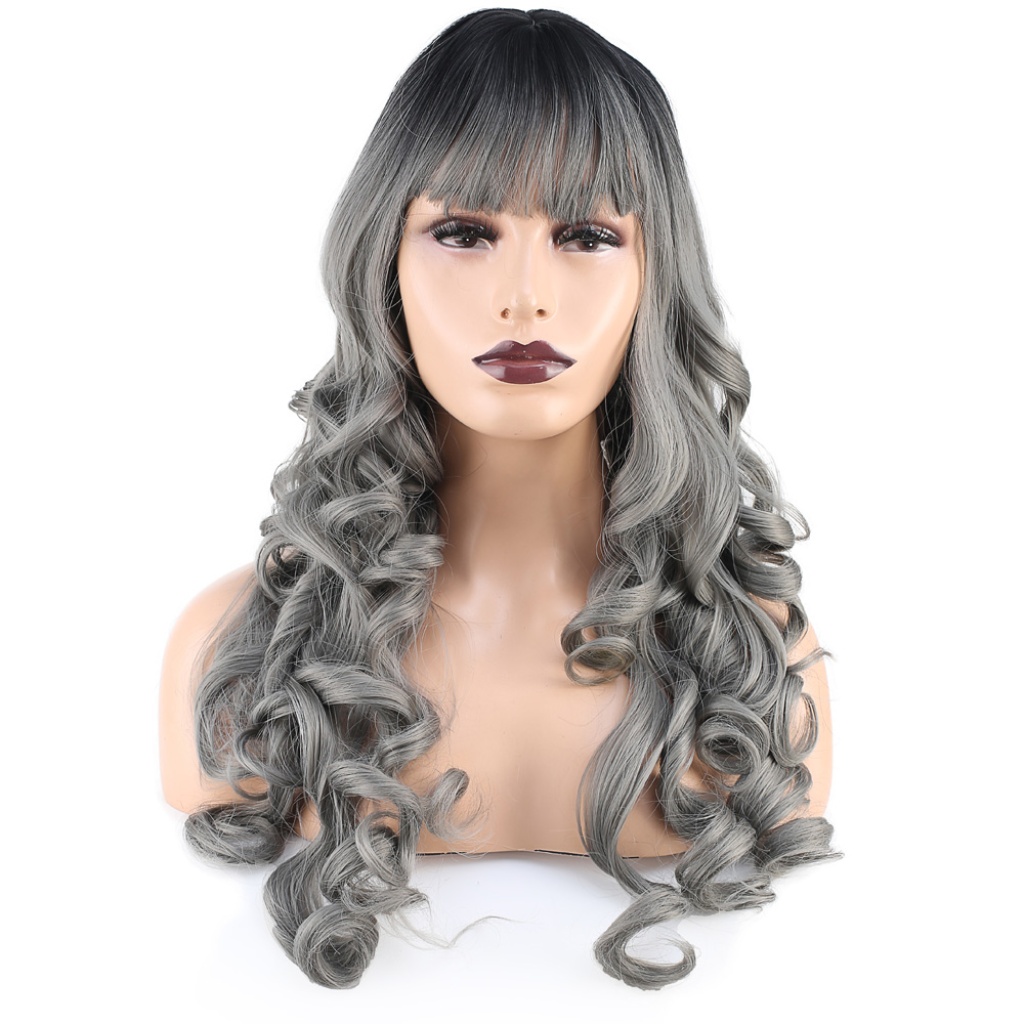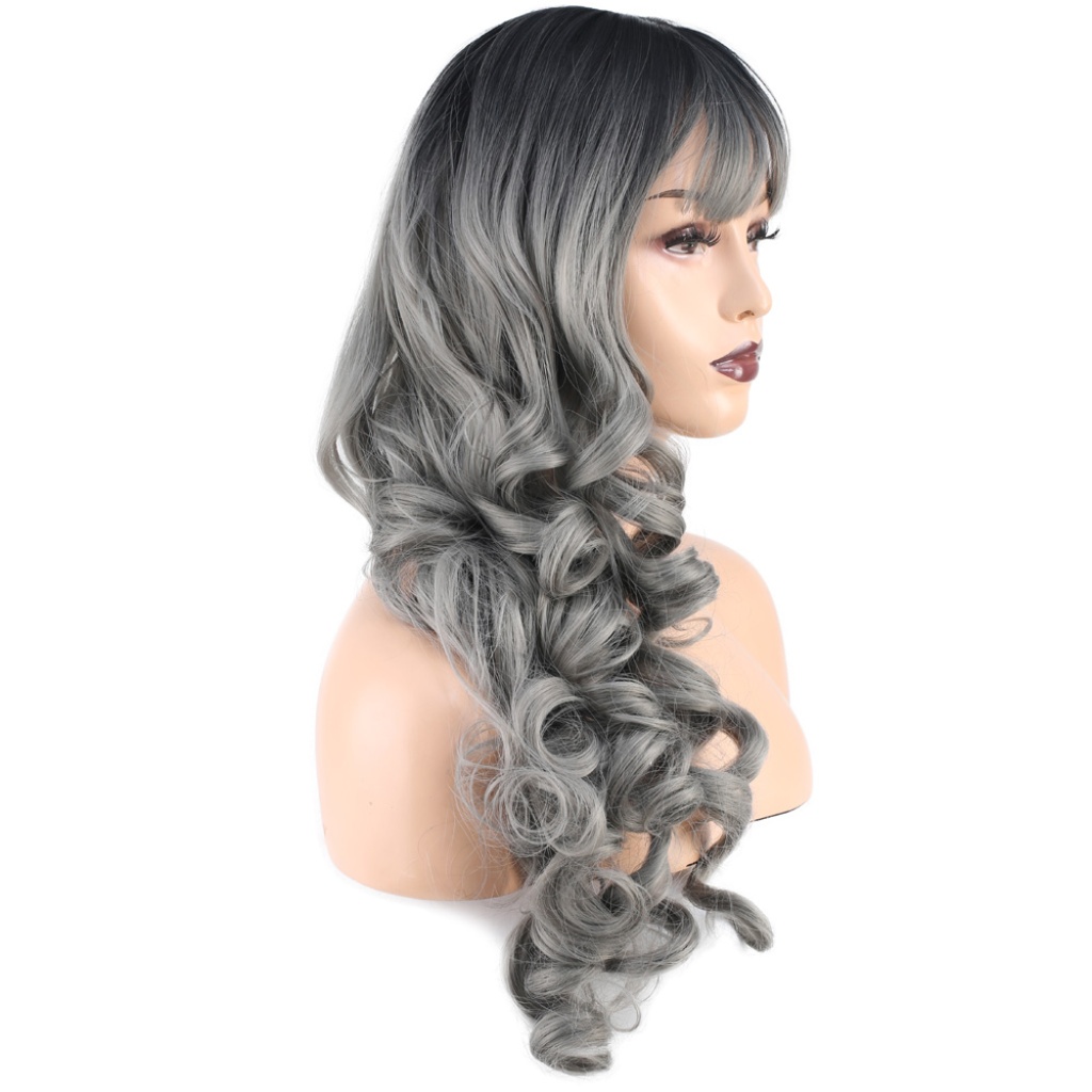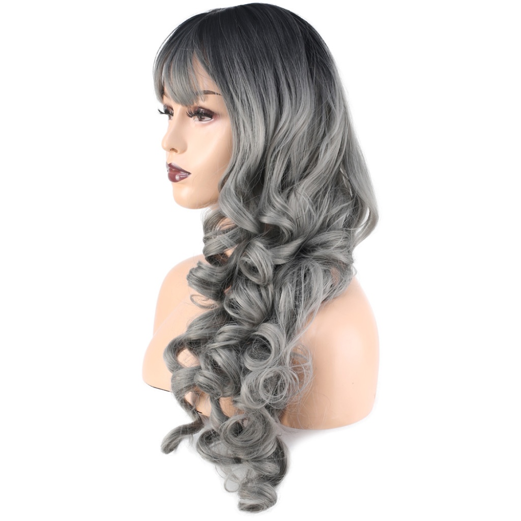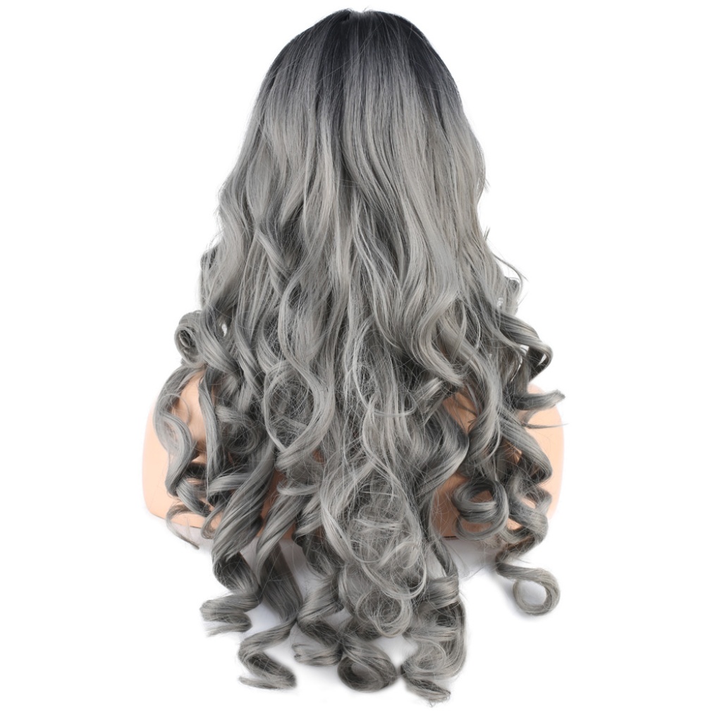 Dalgalı Perçemli Uzun Fiber Sentetik Peruk - Siyah / Gri Ombreli
