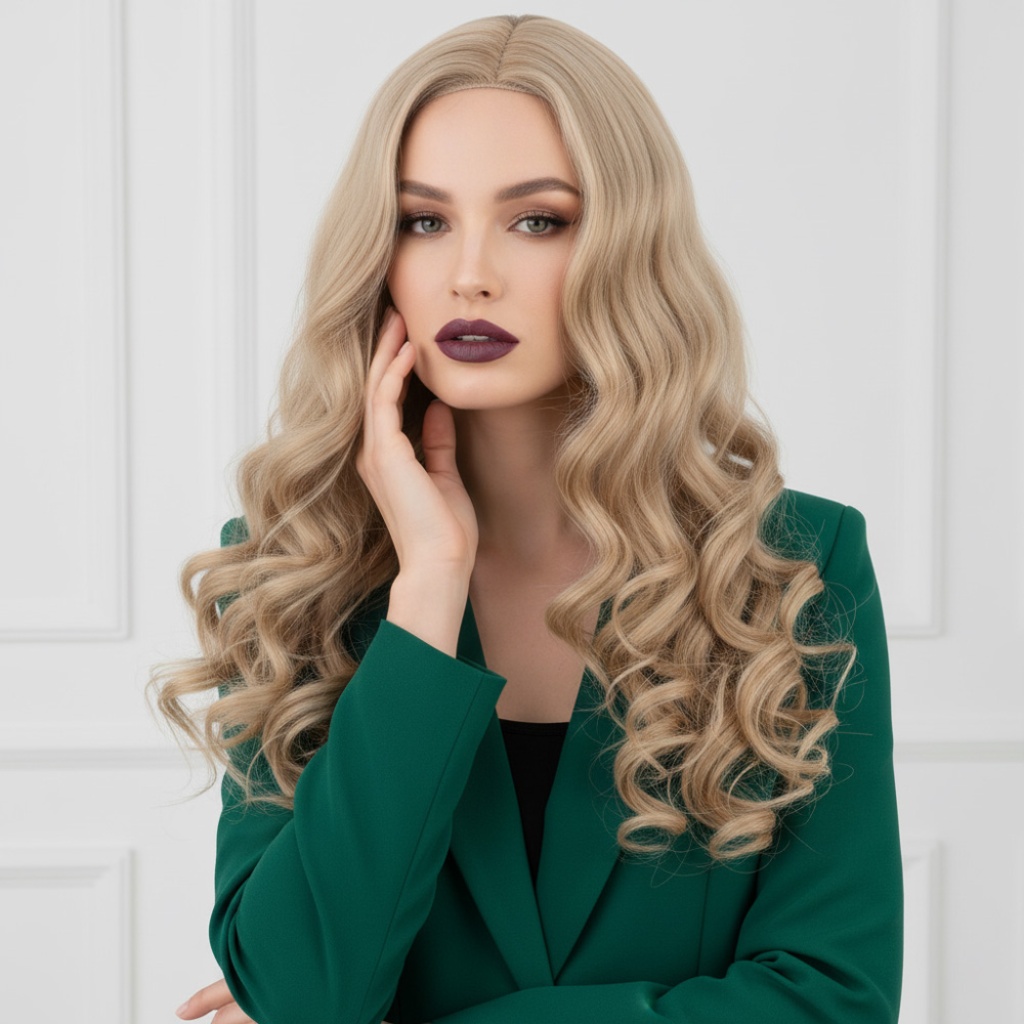Dalgalı Perçemsiz Uzun Fiber Sentetik Peruk - Platin