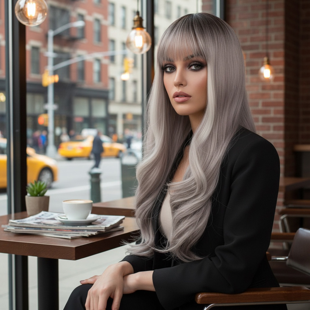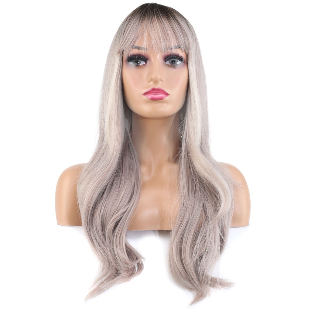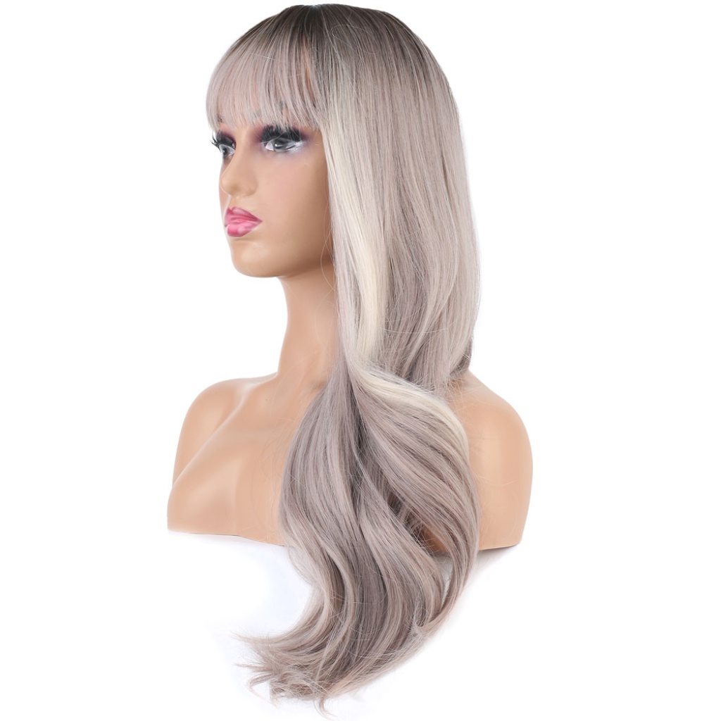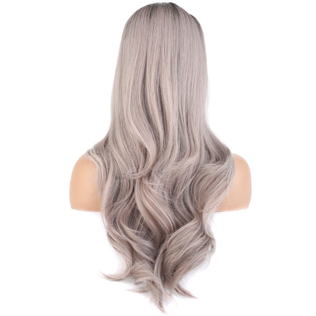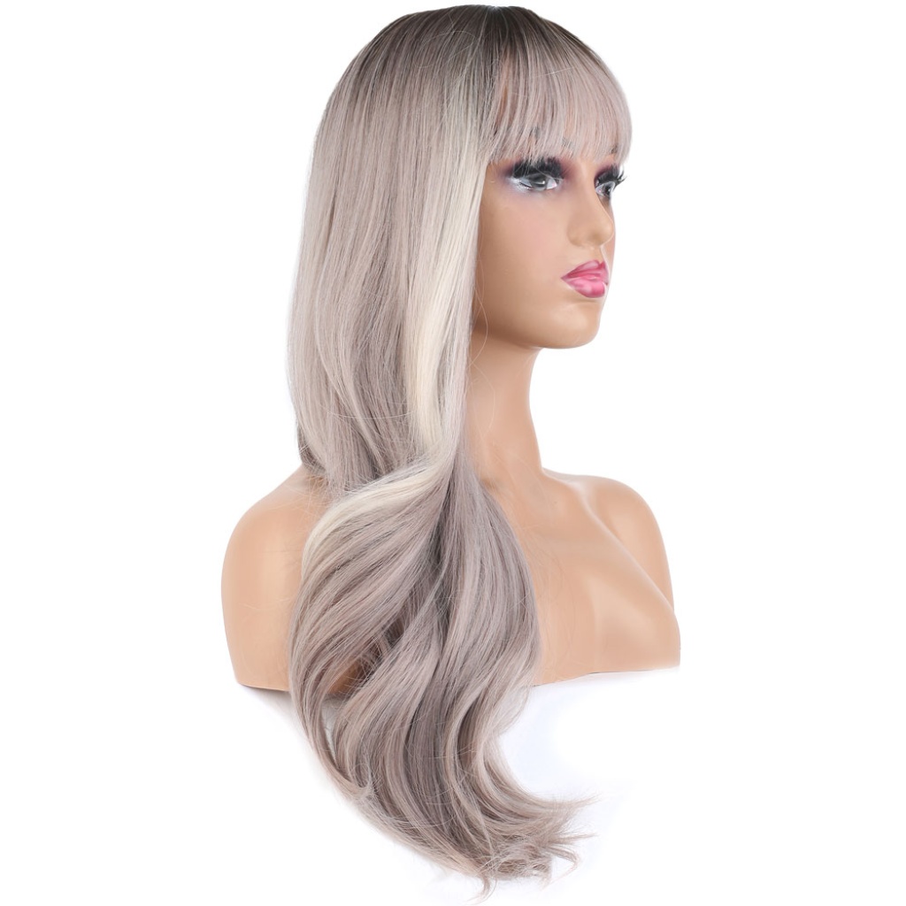 Doğal Dalgalı Perçemli Fiber Sentetik Uzun Boy Peruk - Koyu Kumral / Açık Rus Kumralı Ombre ve Röfleli