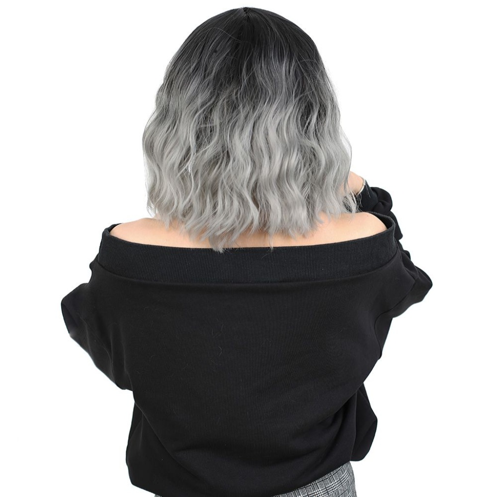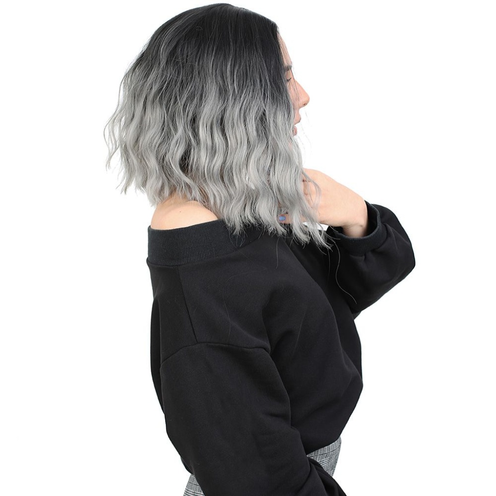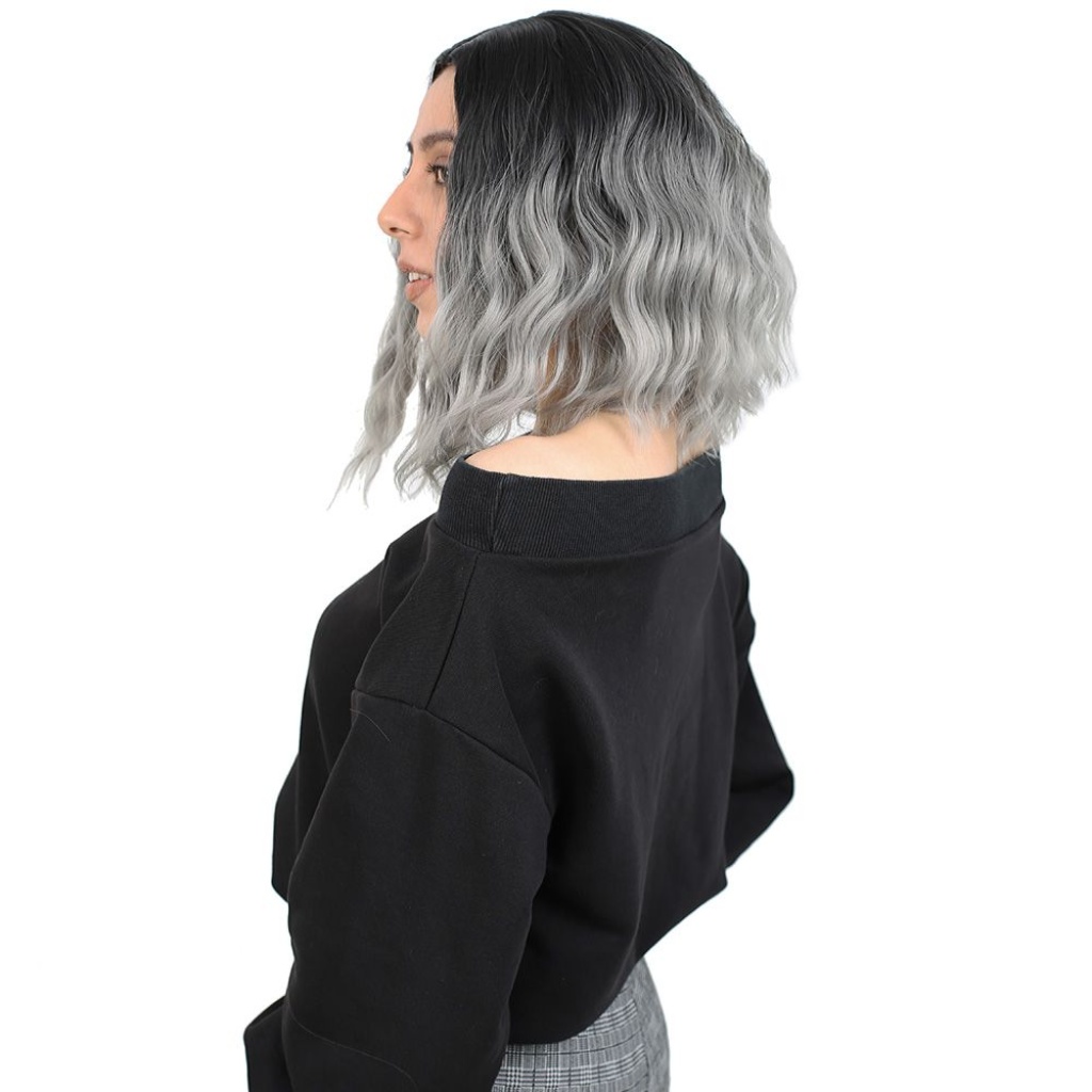 Fiber Sentetik Kısa Dalgalı Perçemsiz Peruk - Siyah / Gri Ombreli
