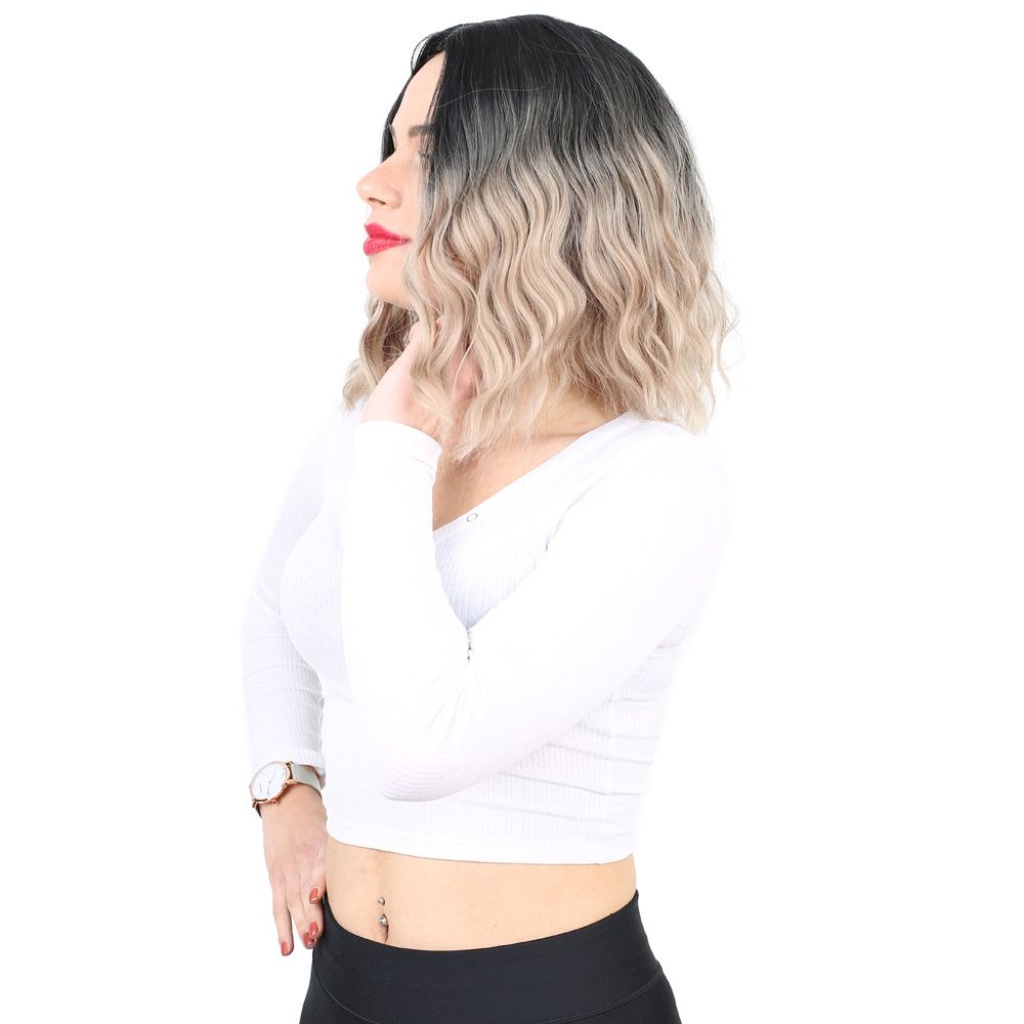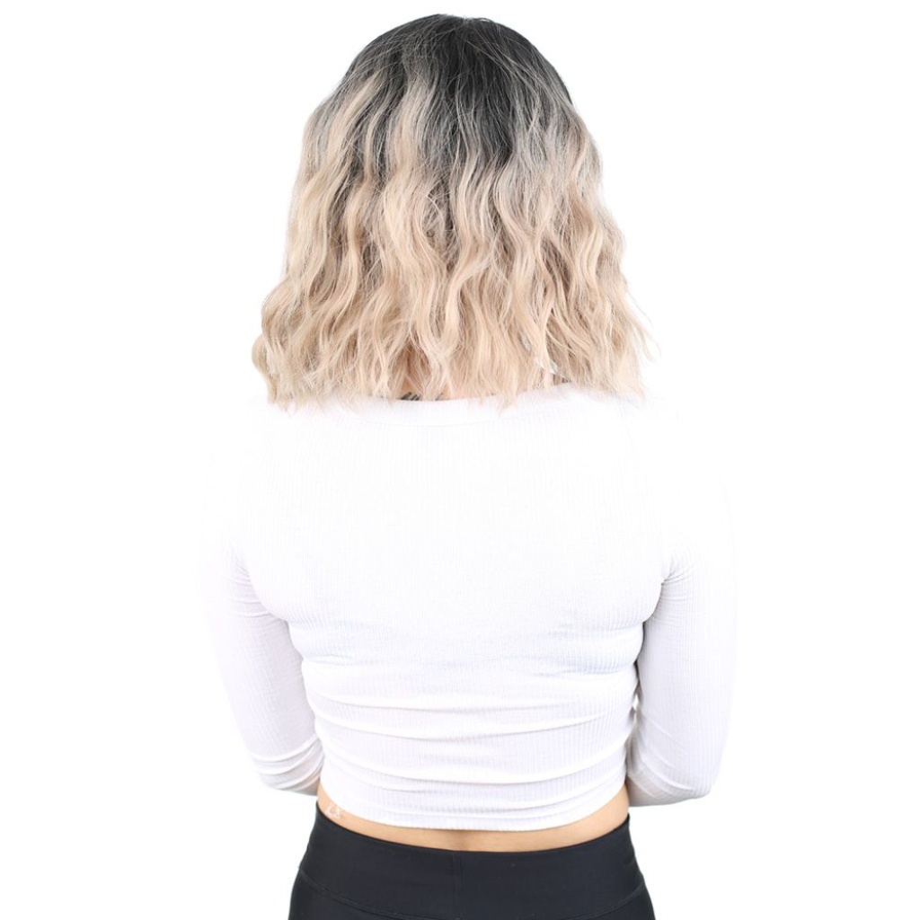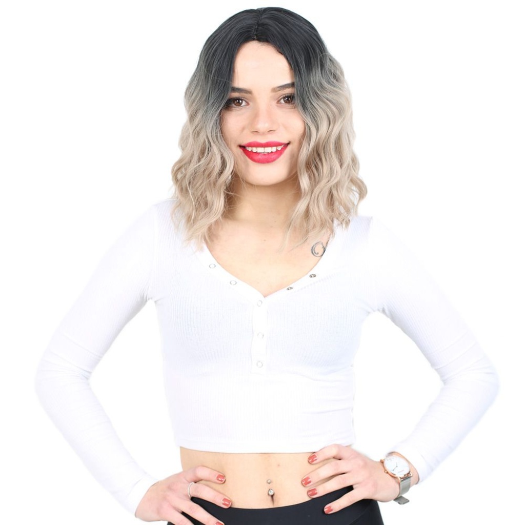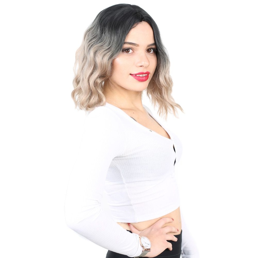 Fiber Sentetik Kısa Dalgalı Perçemsiz Peruk - Siyah / Küllü Bebek Sarı Ombreli