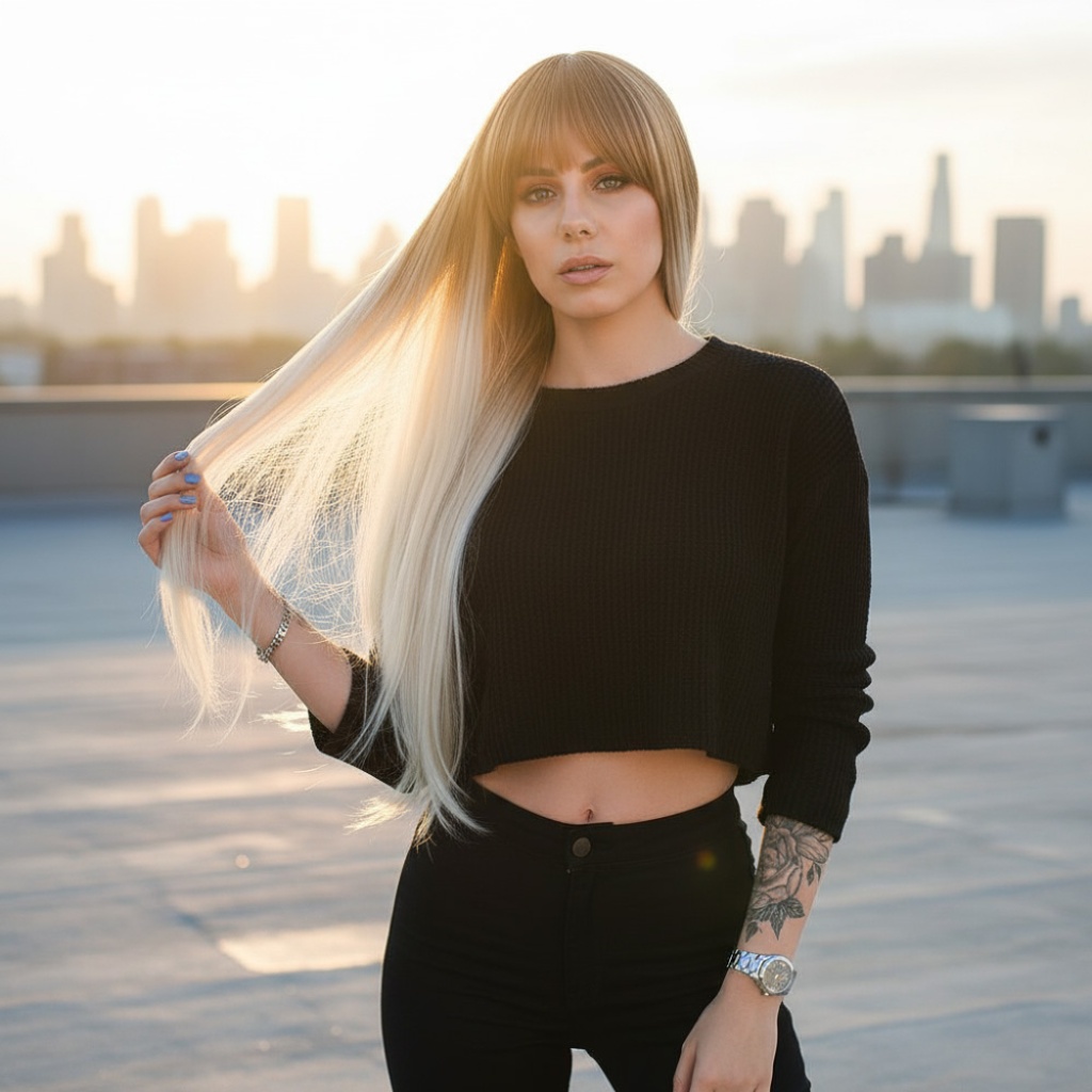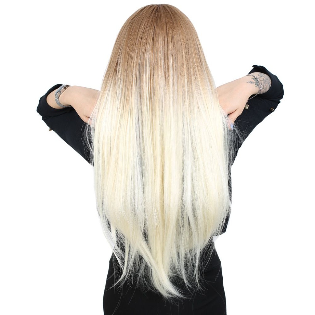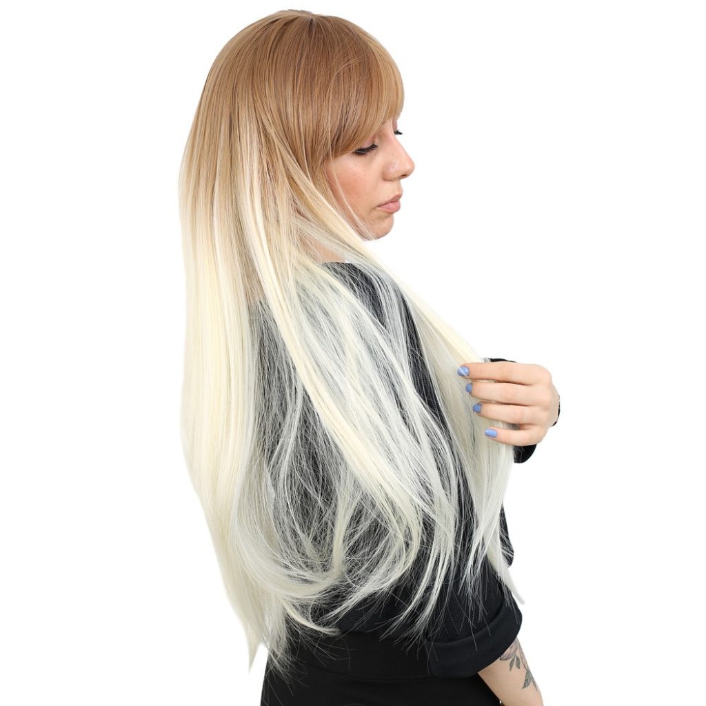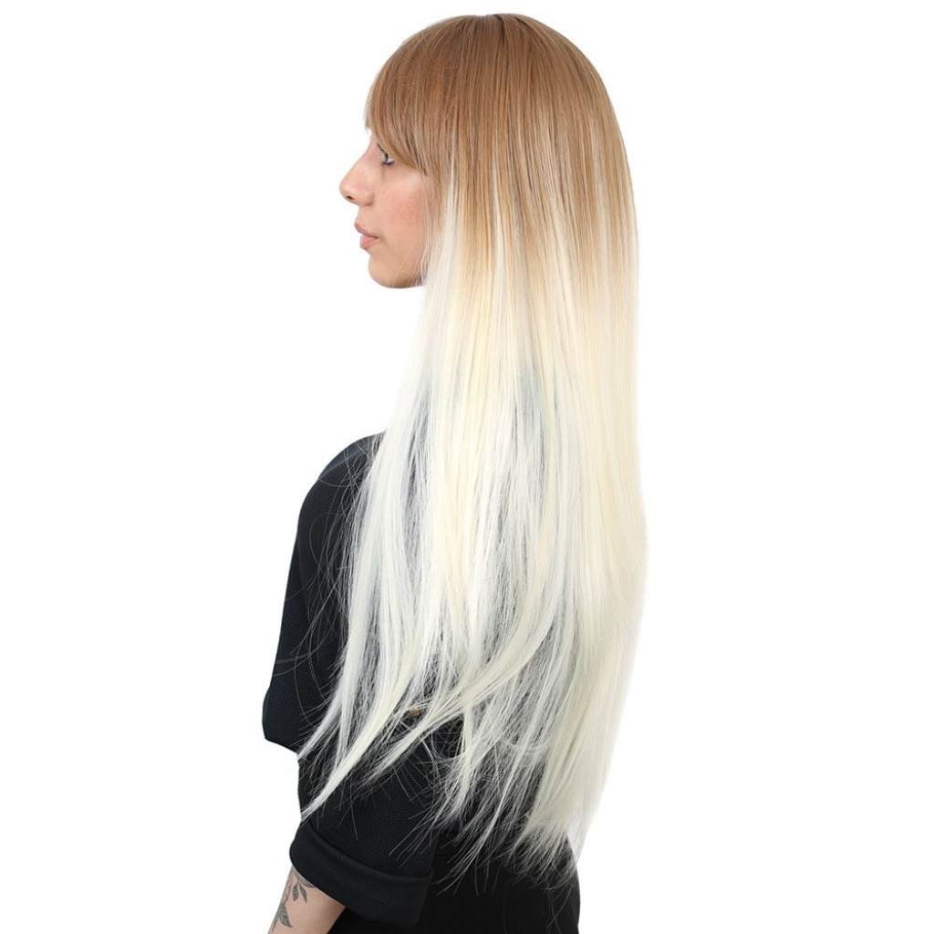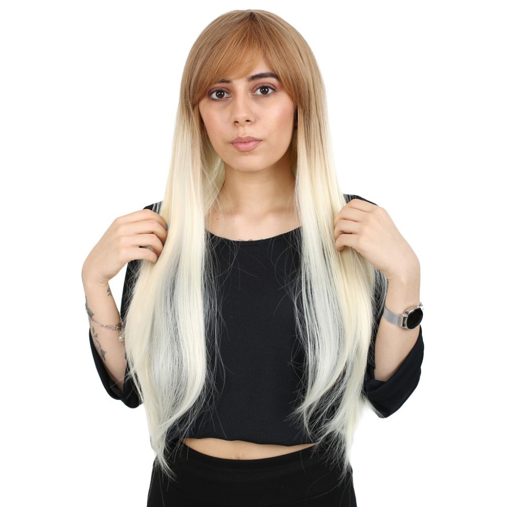 Fiber Sentetik Uzun Düz Kahküllü Peruk - Balköpüğü / Platin Ombreli