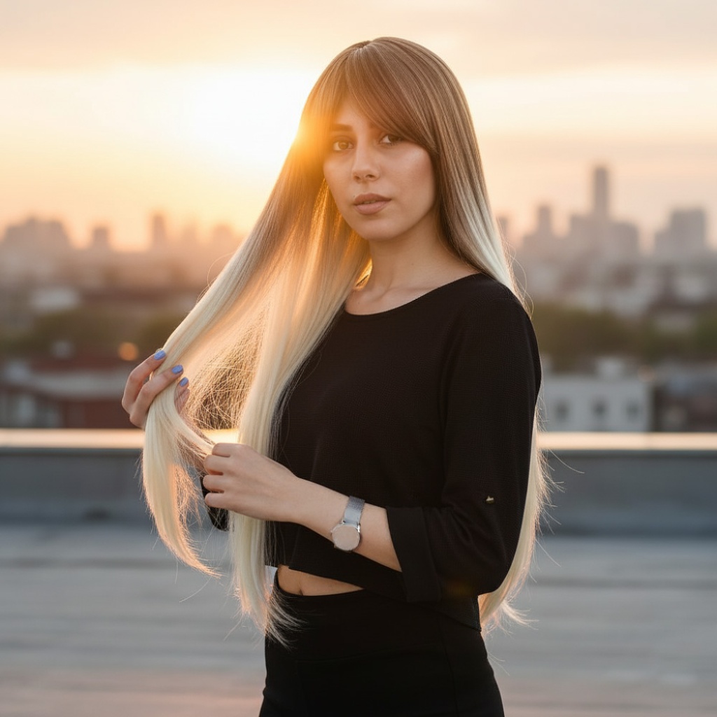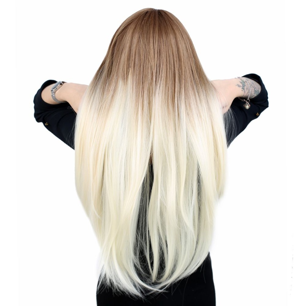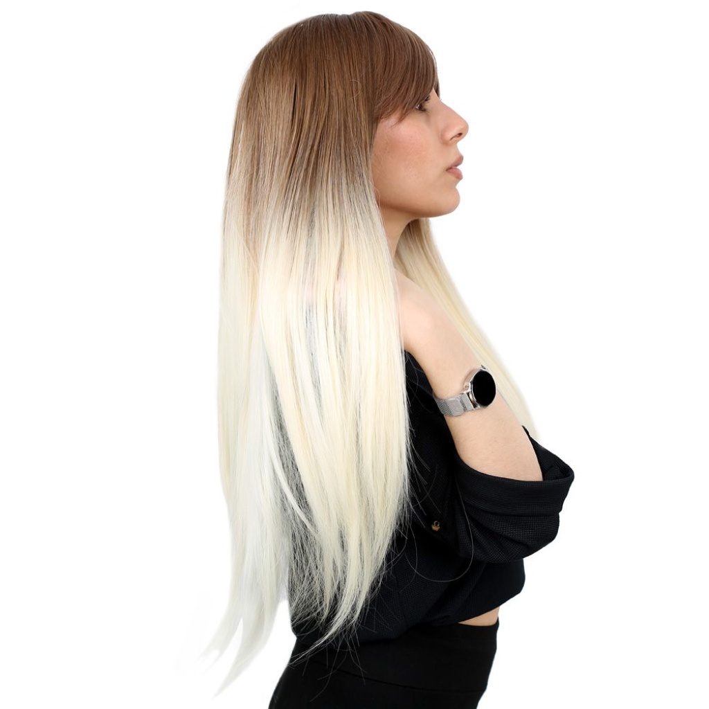 Fiber Sentetik Uzun Düz Kahküllü Peruk - Kumral / Platin Ombreli