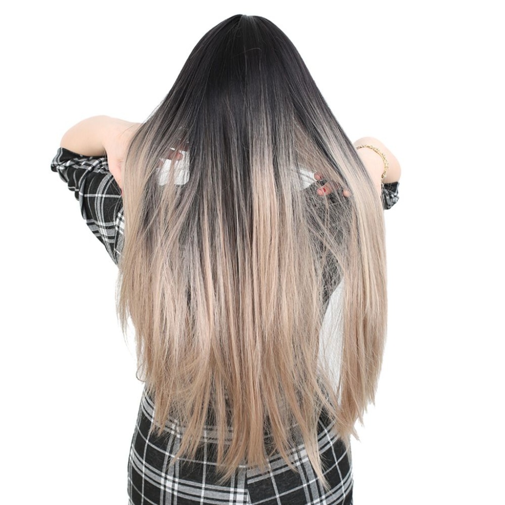 Fiber Sentetik Uzun Düz Kahküllü Peruk - Siyah / Küllü Bebek Sarı Ombreli
