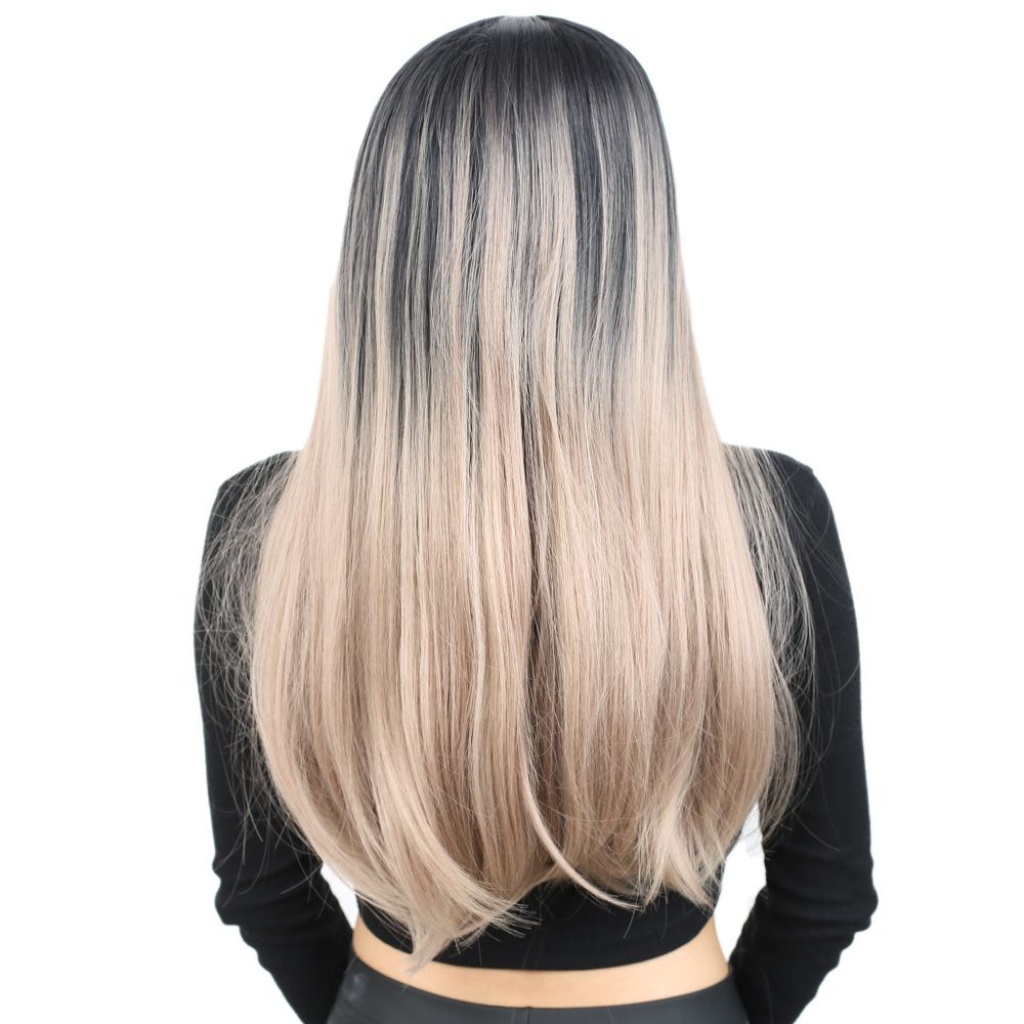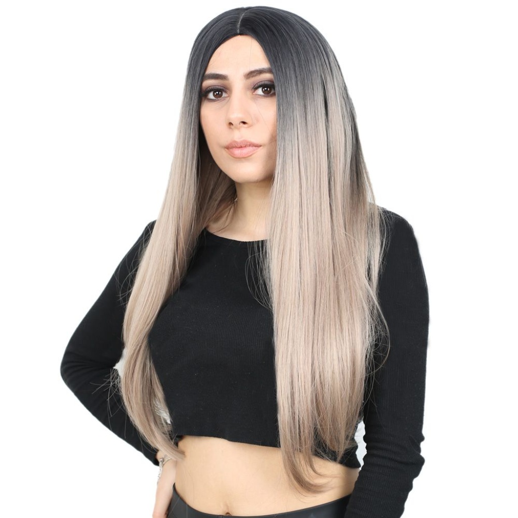 Fiber Sentetik Uzun Düz Peruk - Siyah / Küllü Bebek Sarı Ombreli