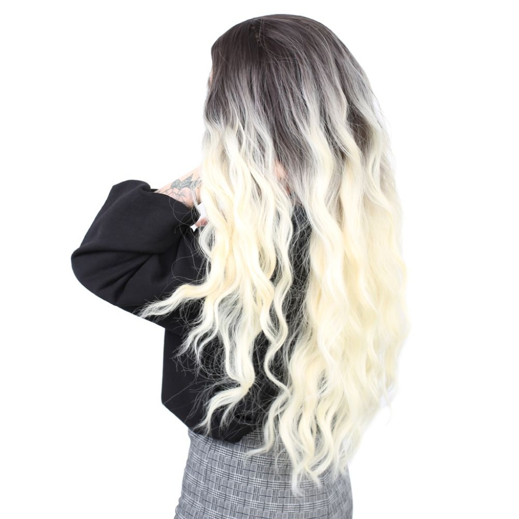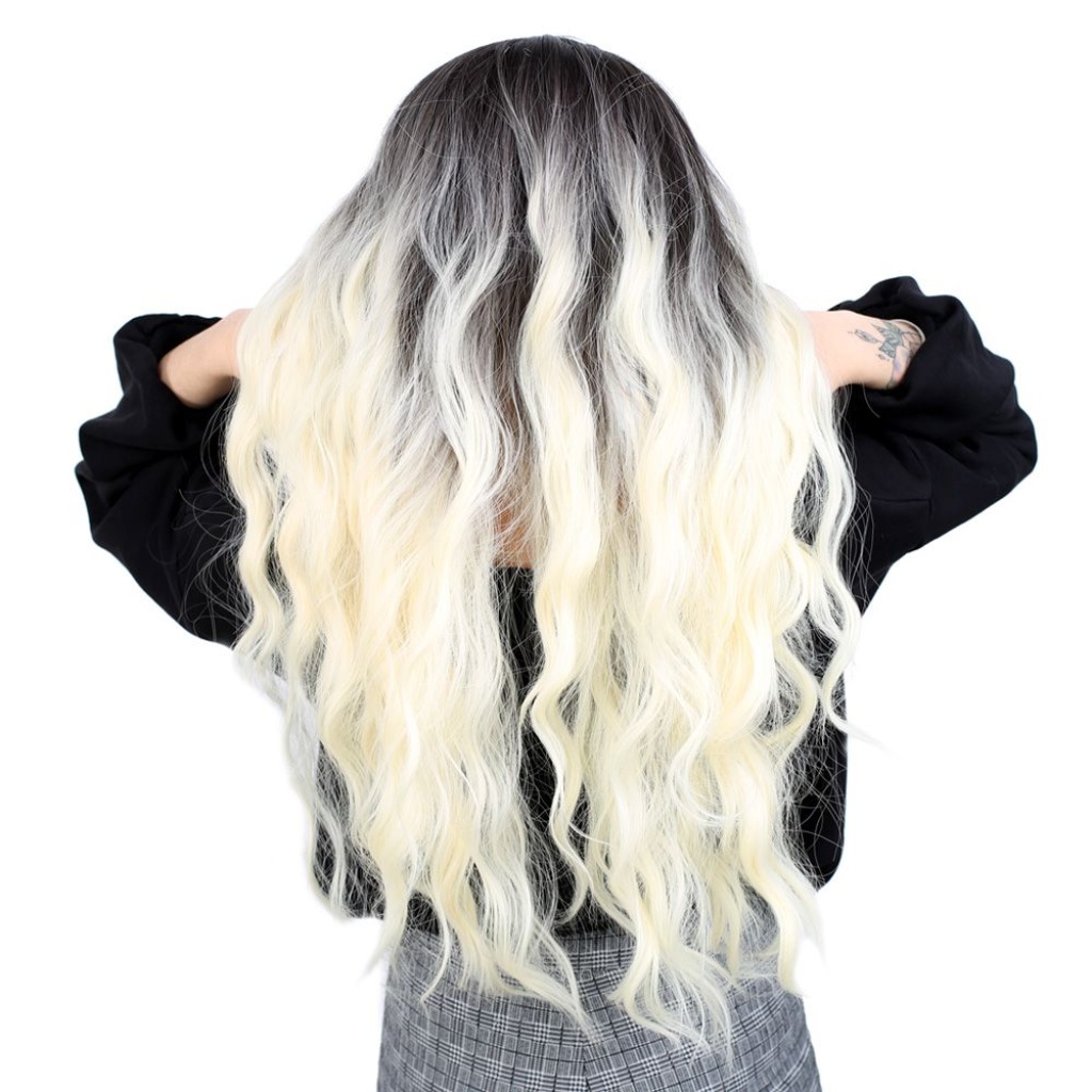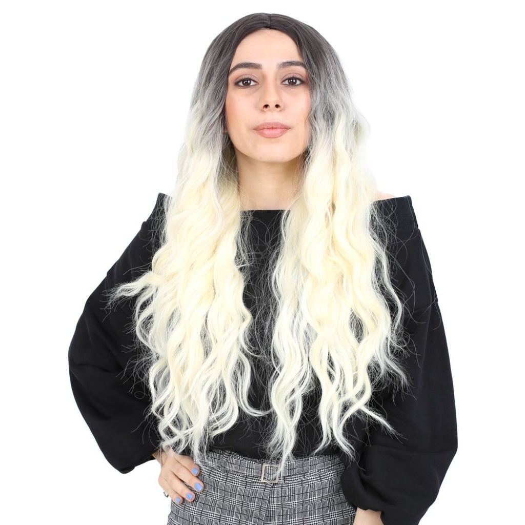 Fiber Sentetik Uzun Su Dalgası Peruk - Açık Siyah / Platin Ombreli