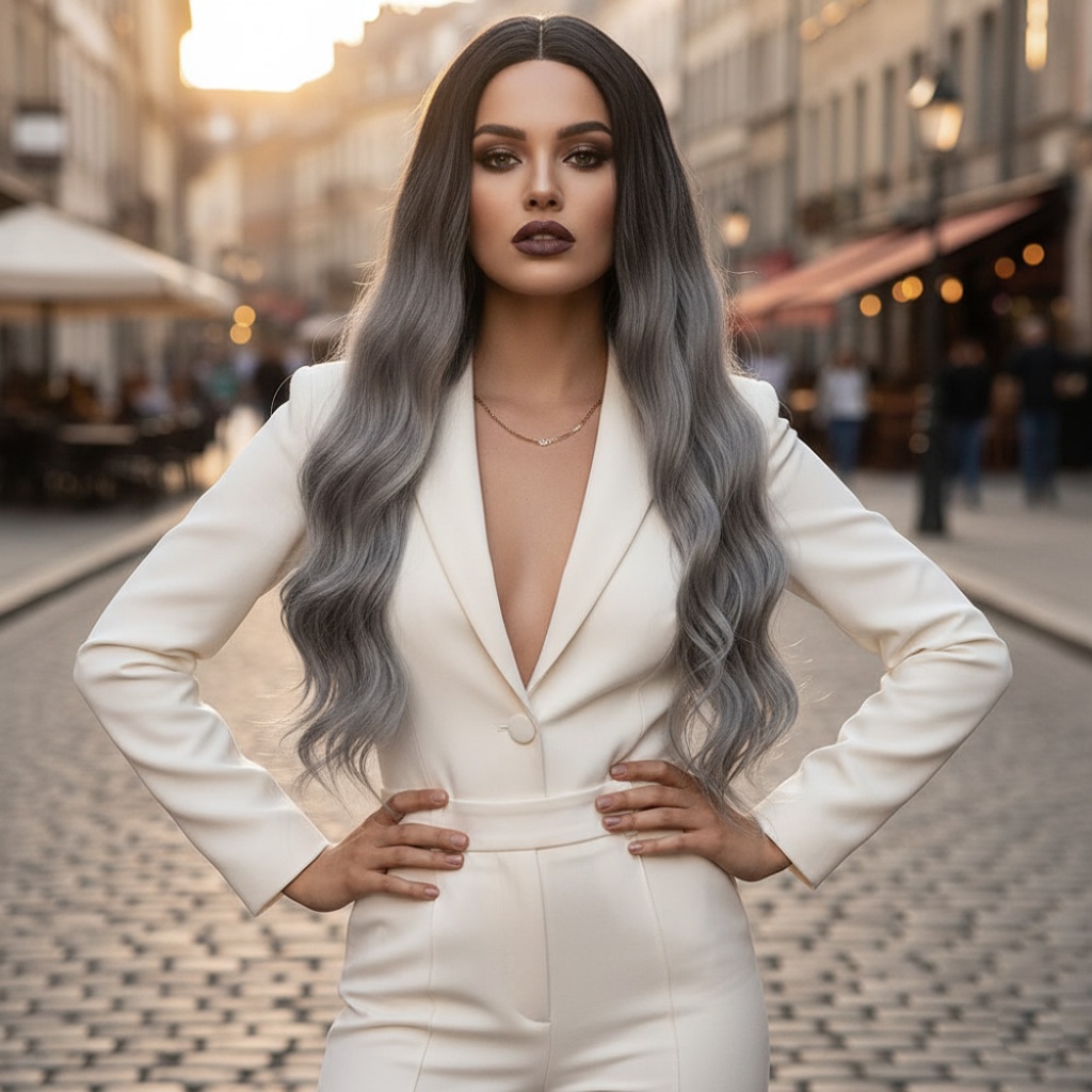 Fiber Sentetik Uzun Su Dalgası Peruk - Siyah Gri Ombreli