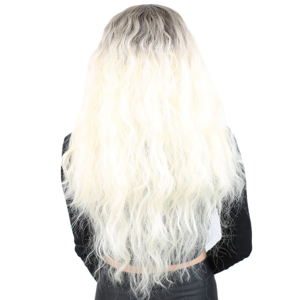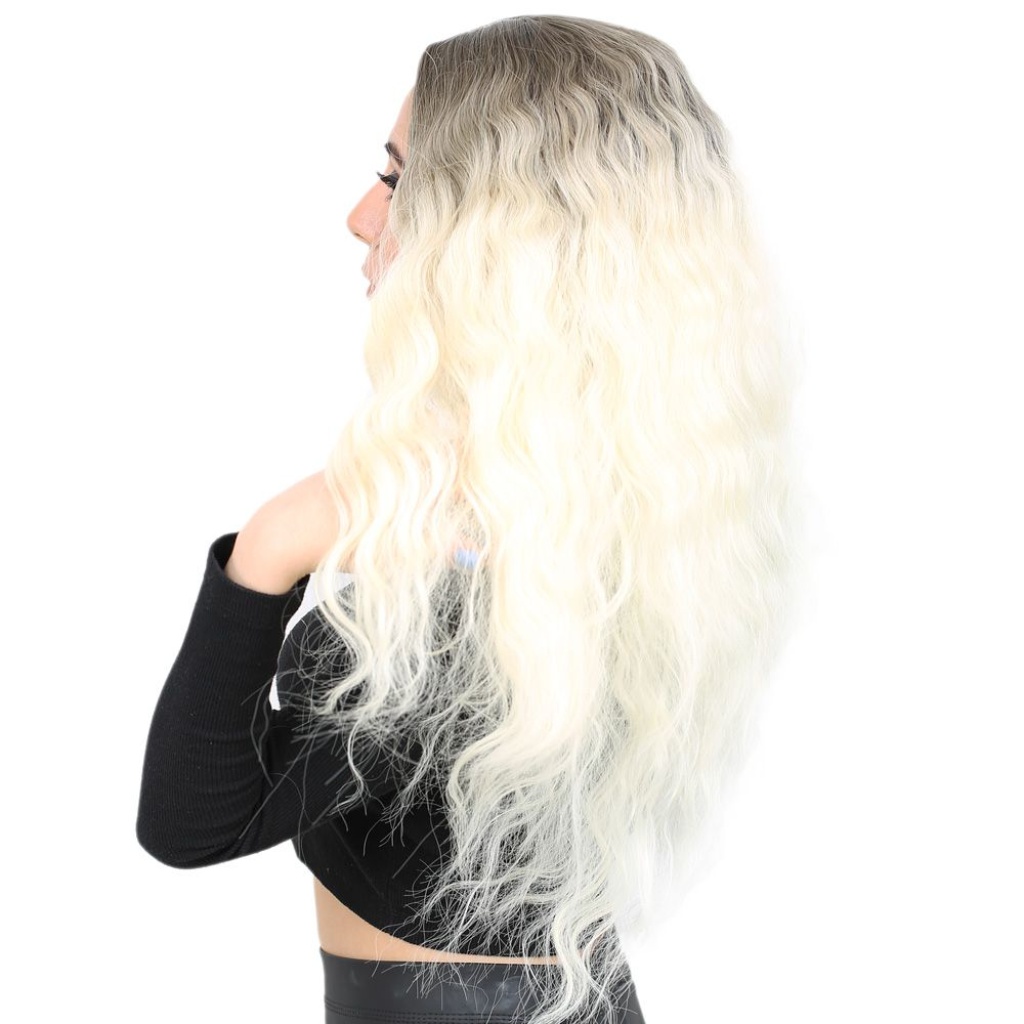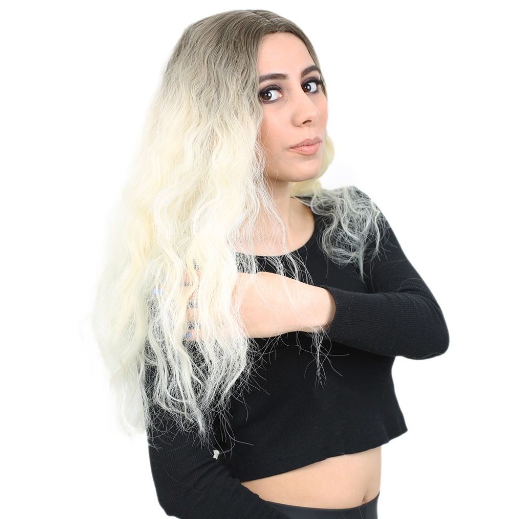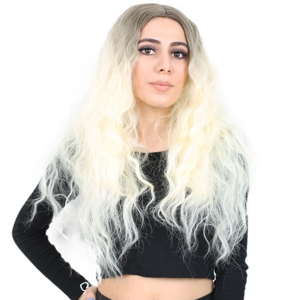 Kabarık Dalgalı Uzun Fiber Sentetik Peruk - Küllü Açık Kahve / Platin Ombreli