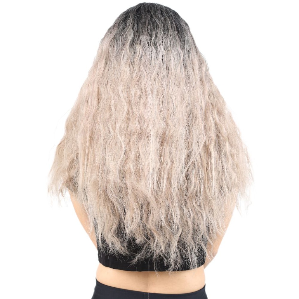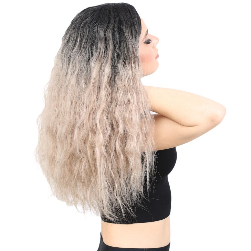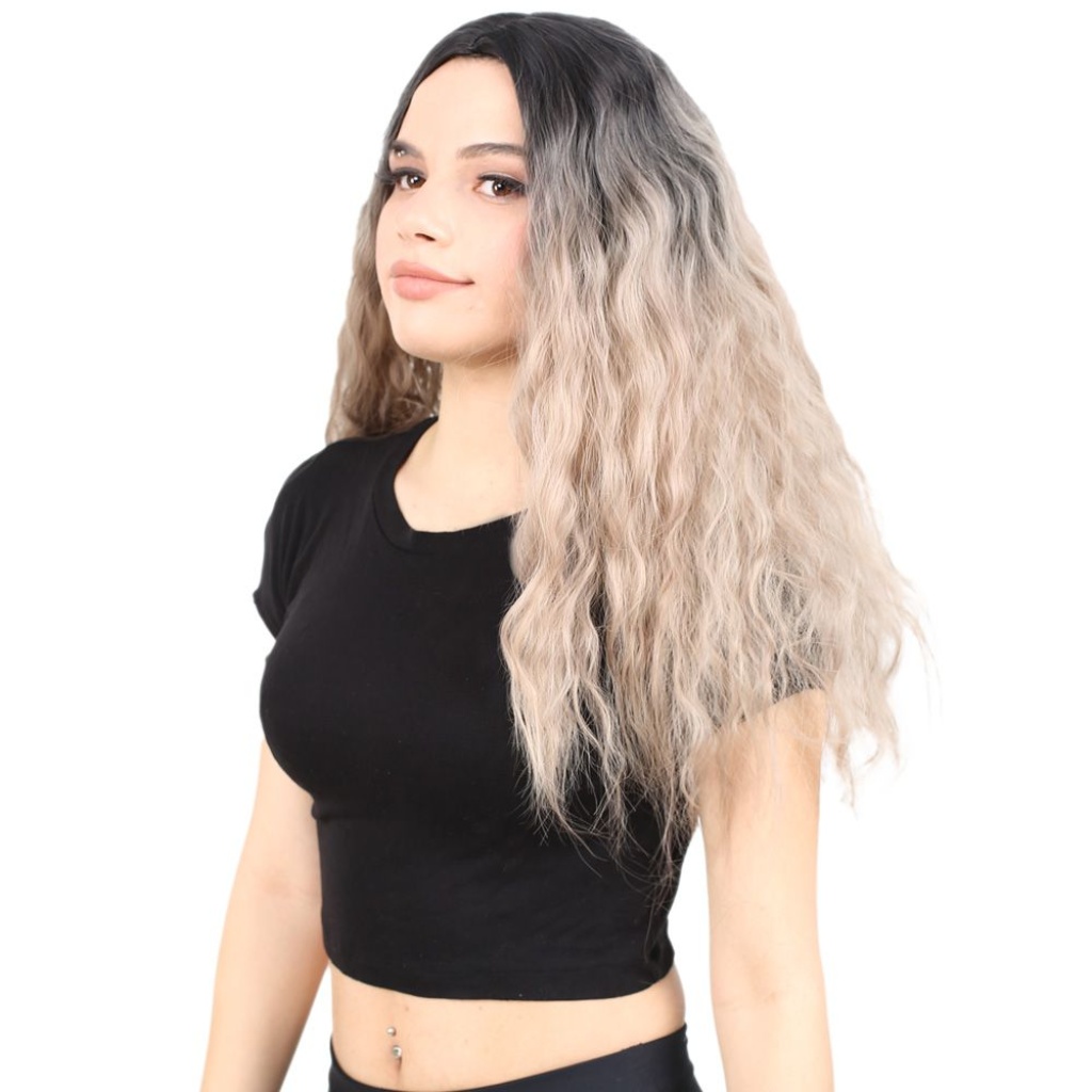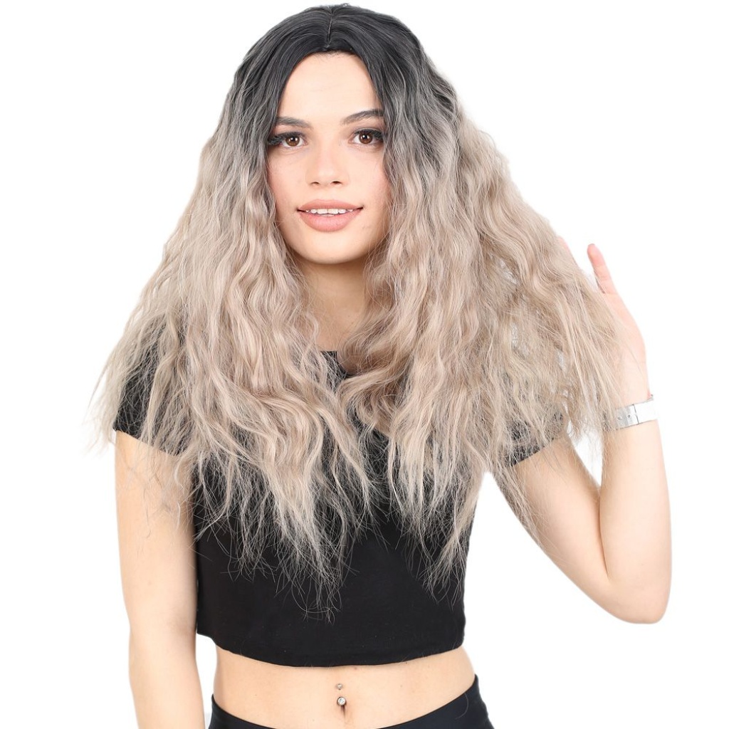 Kabarık Dalgalı Uzun Fiber Sentetik Peruk - Siyah / Küllü Bebek Sarı Ombreli