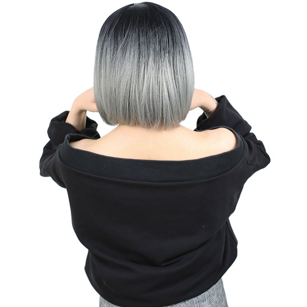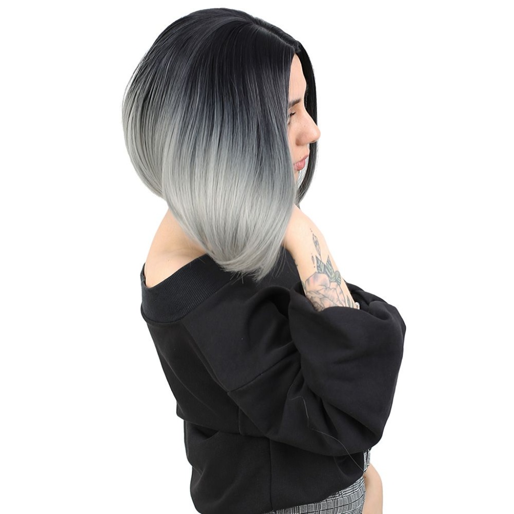 Kahkülsüz Düz Kısa Fiber Sentetik Peruk - Siyah / Gri Ombreli