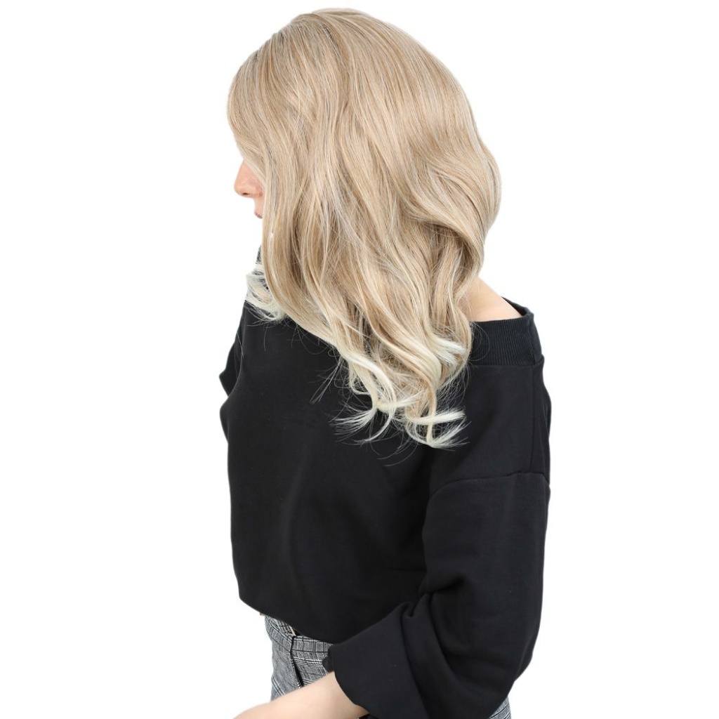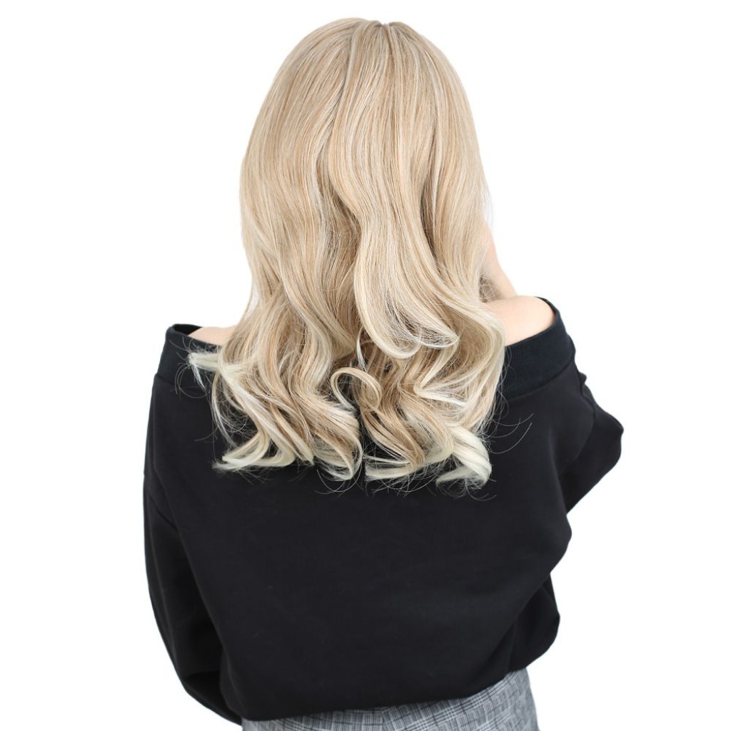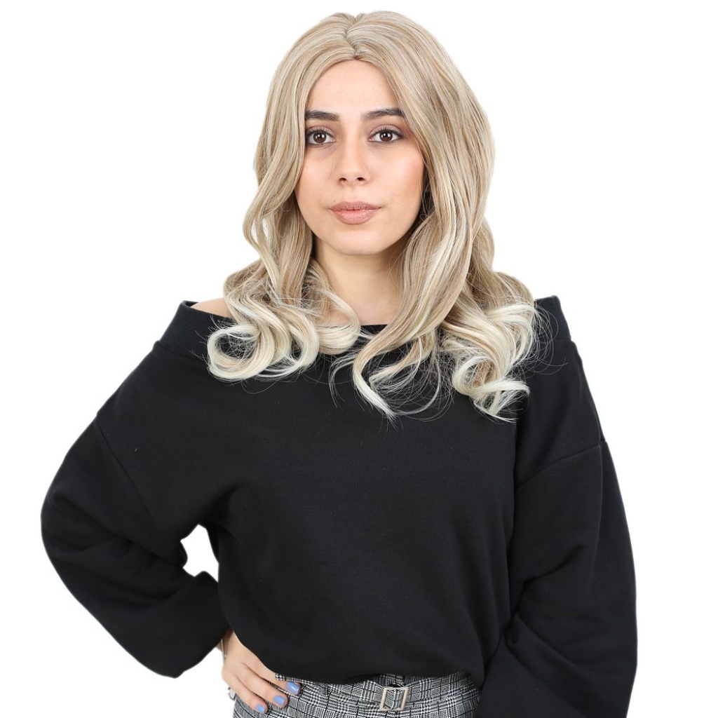 Kahkülsüz Fiber Sentetik Orta Boy Dalgalı Peruk - Karamel / Platin Röfleli