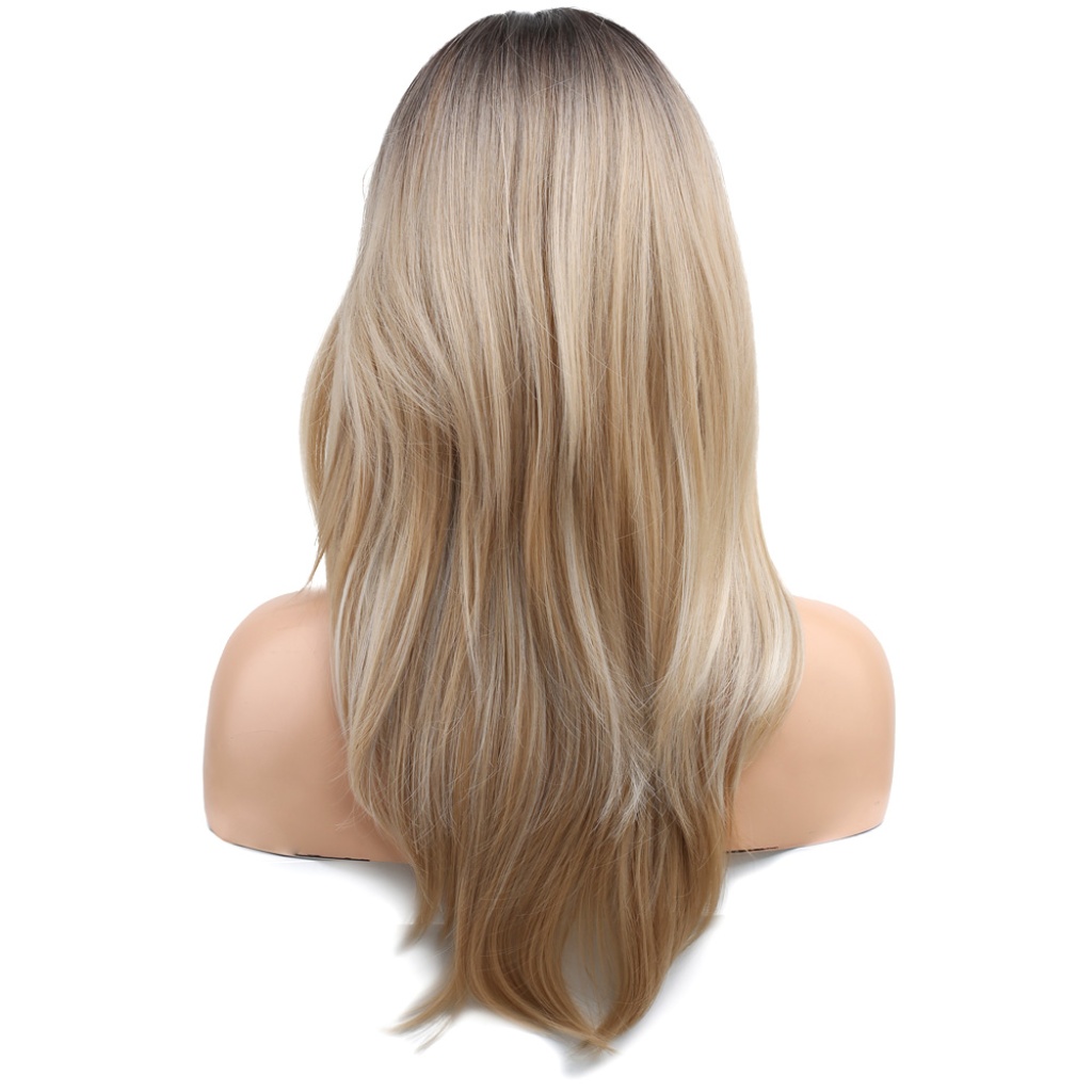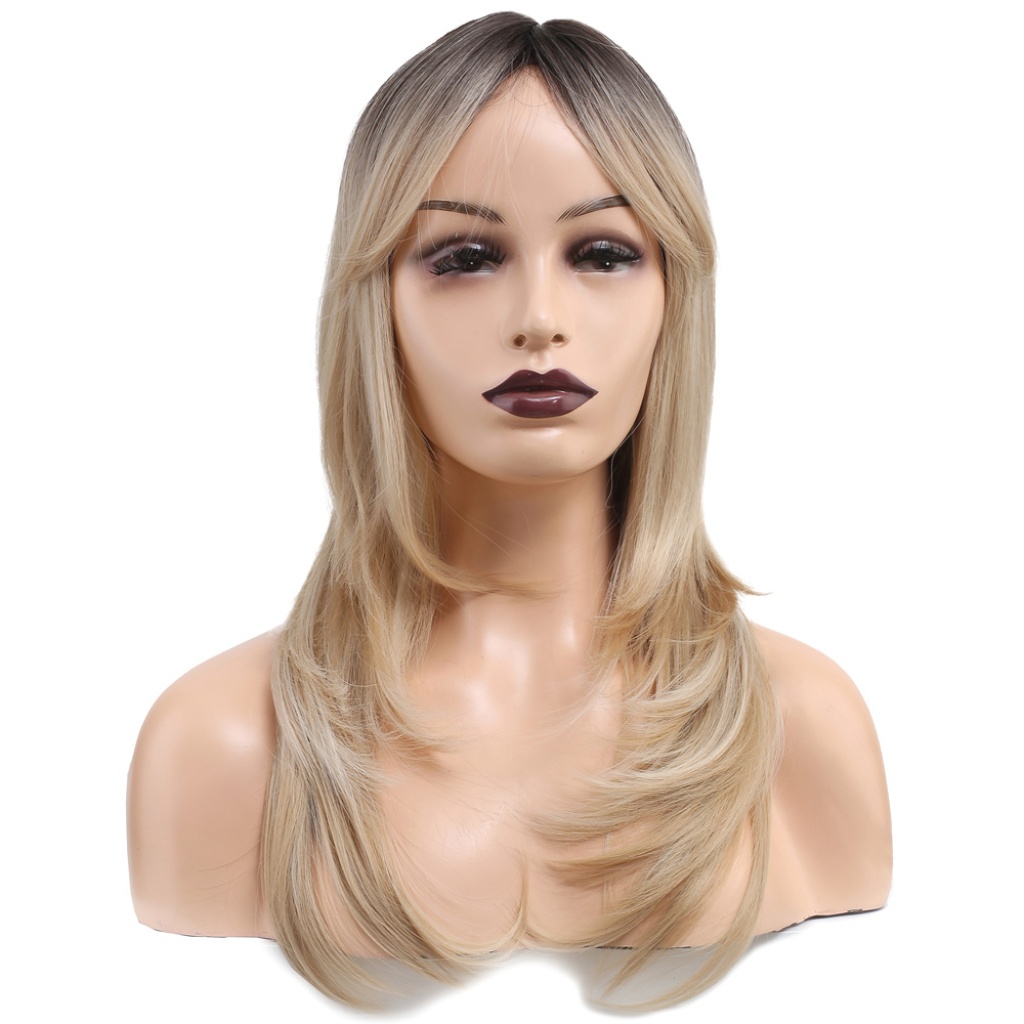 Katlı Kesim Perçemli Düz Fiber Sentetik Orta Boy Peruk - Kahve / Platin Ombre ve Röfleli