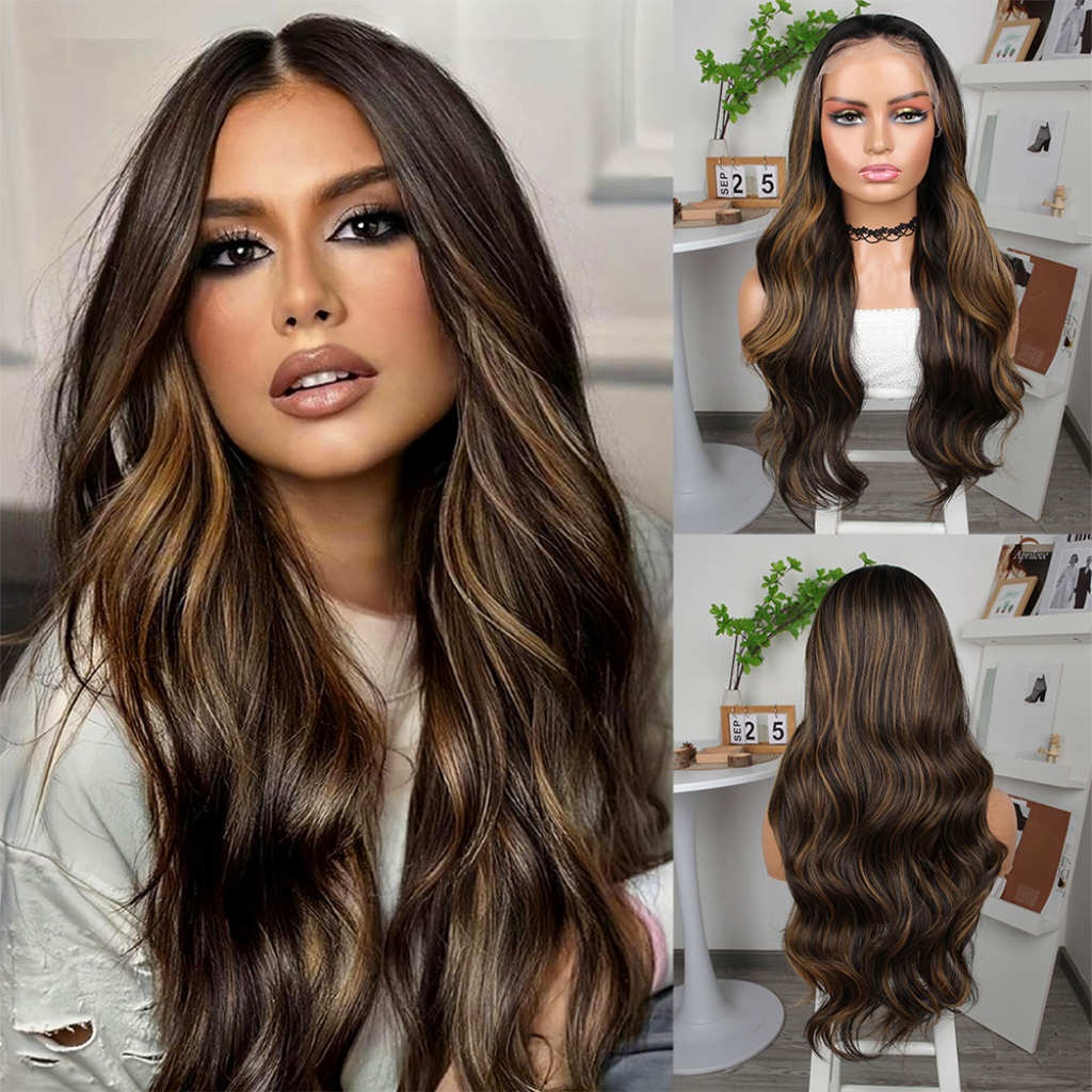 Koyu Kestane Karamel Işıltılı Fiber Sentetik Geniş Dalgalı Tül Peruk