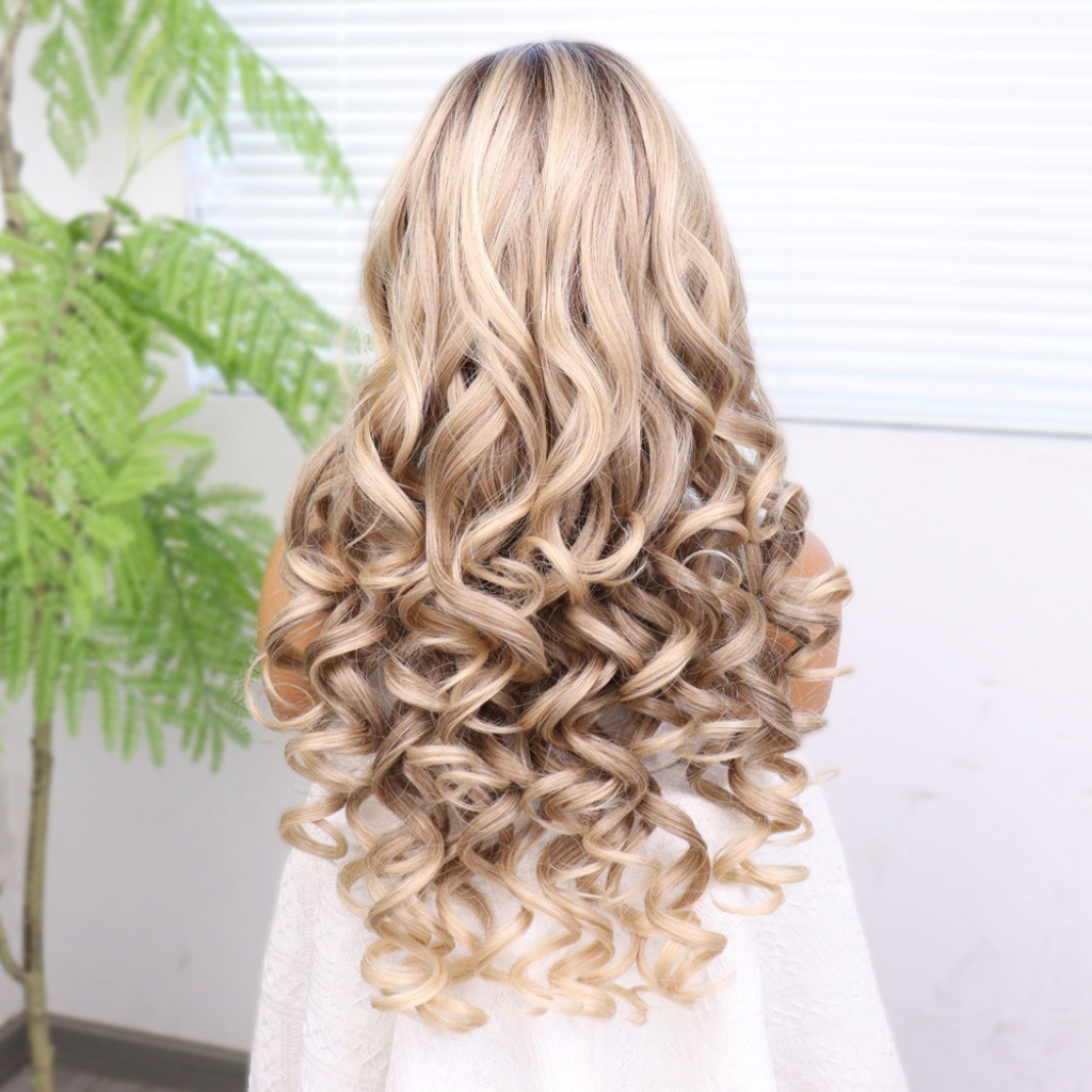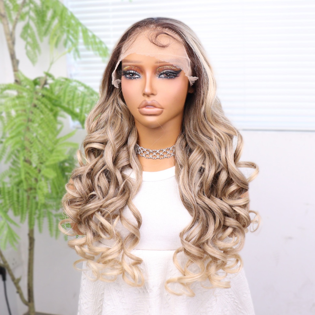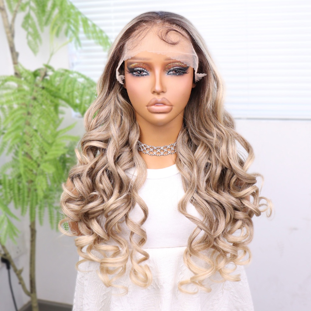 Kumral Platin Ombre Bebek Saçlı Fiber Sentetik Yoğun Dalgalı Tül Peruk