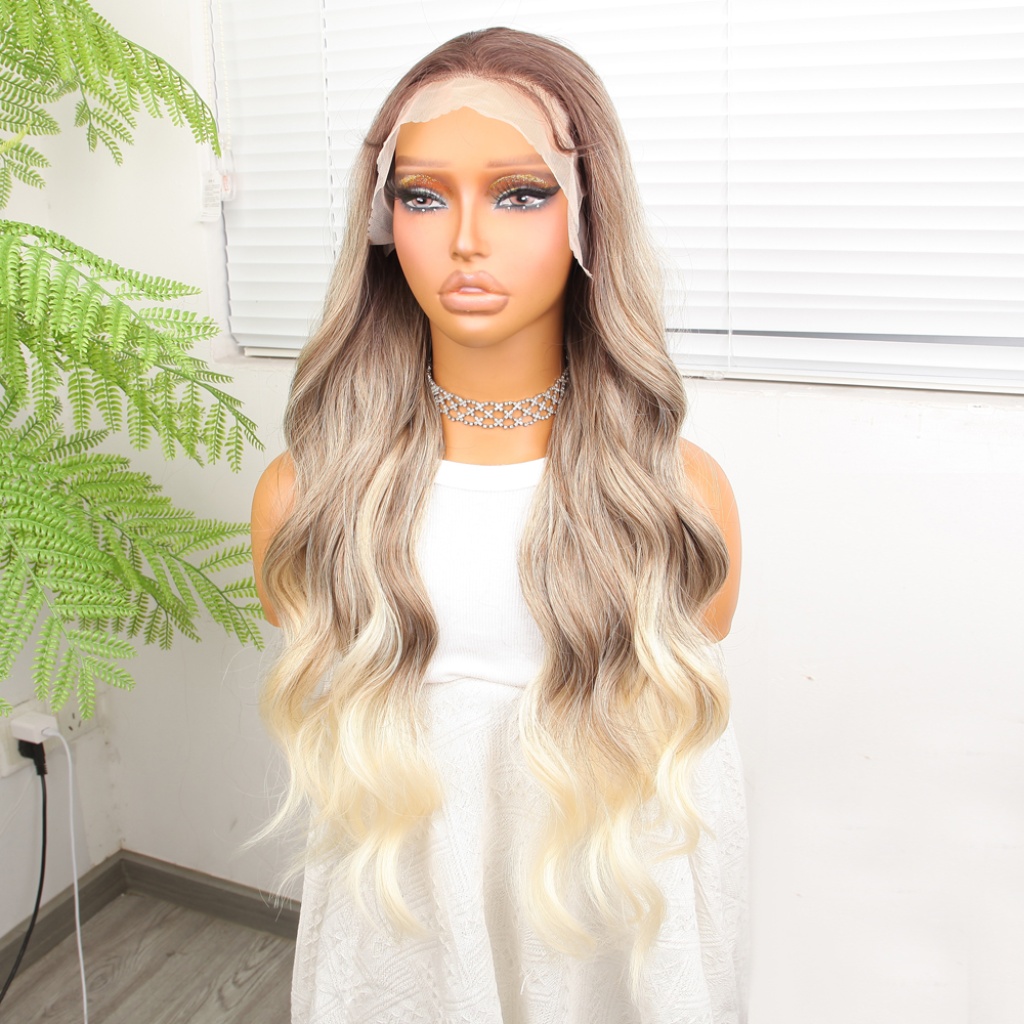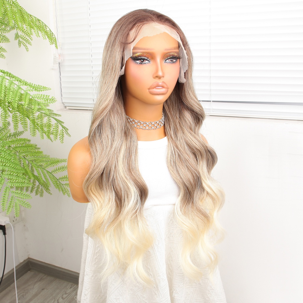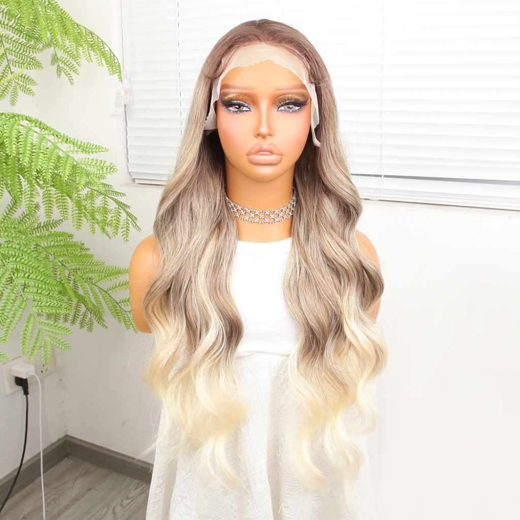 Kumral Platin Ombre ve Röfleli Fiber Sentetik Geniş Dalgalı Tül Peruk