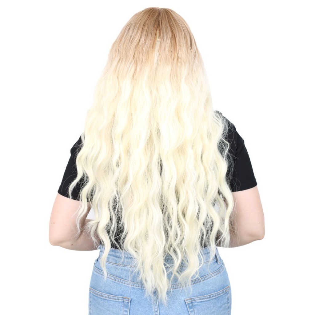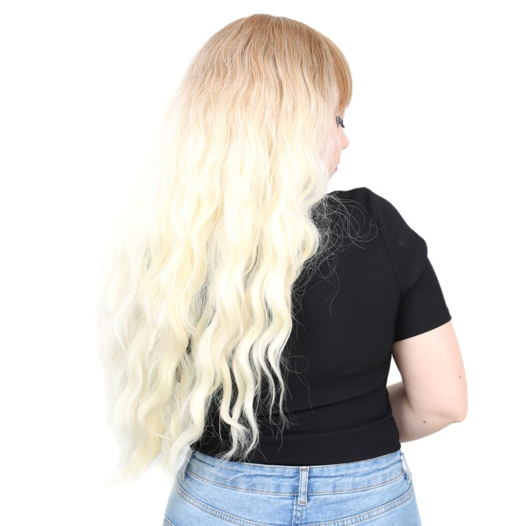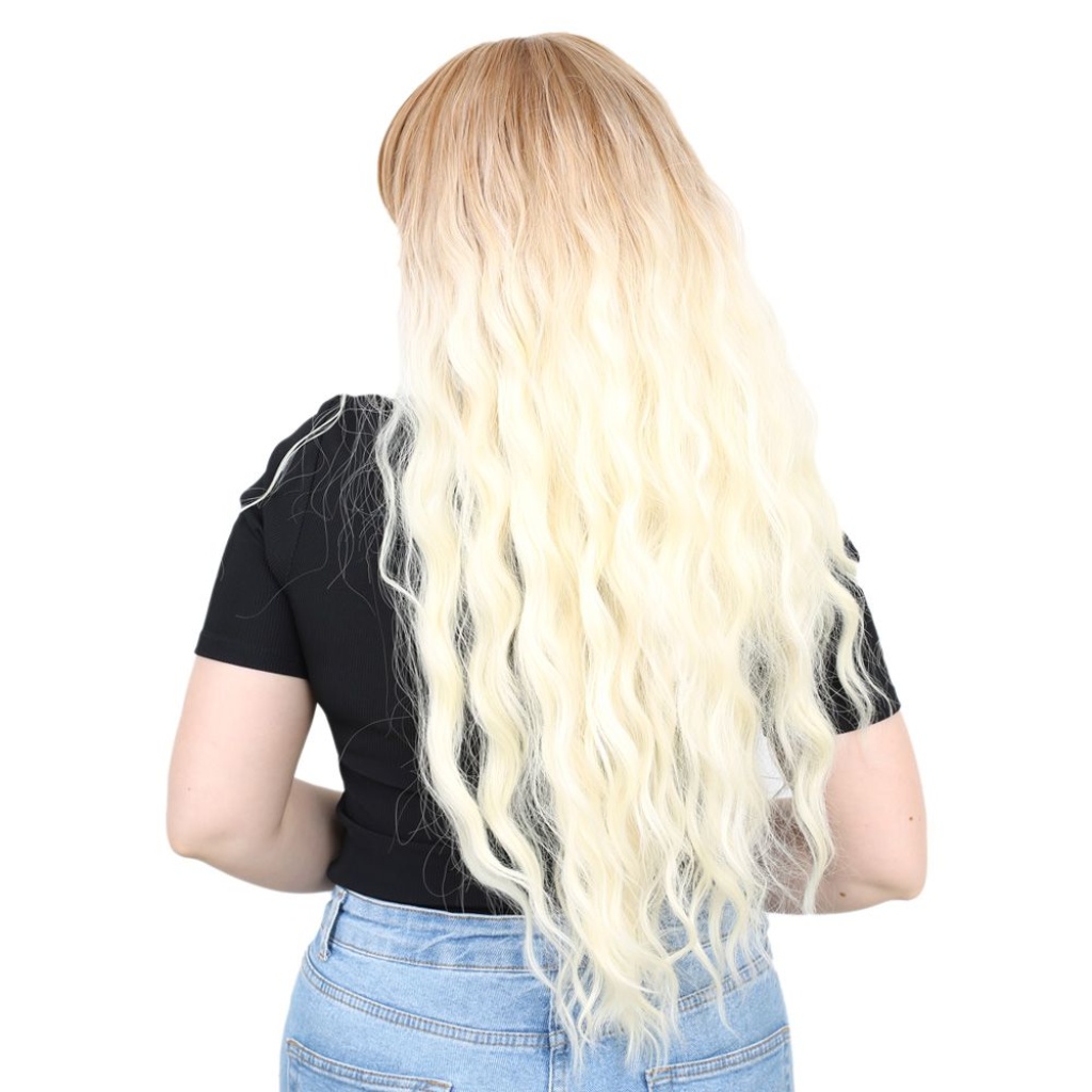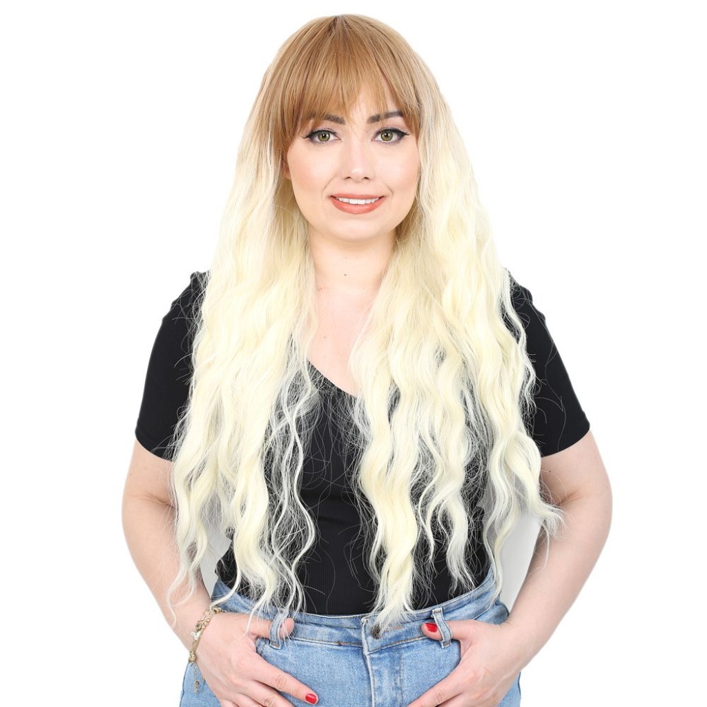 Perçemli Uzun Su Dalgası Fiber Sentetik Peruk - Balköpüğü / Platin Kısa Ombreli