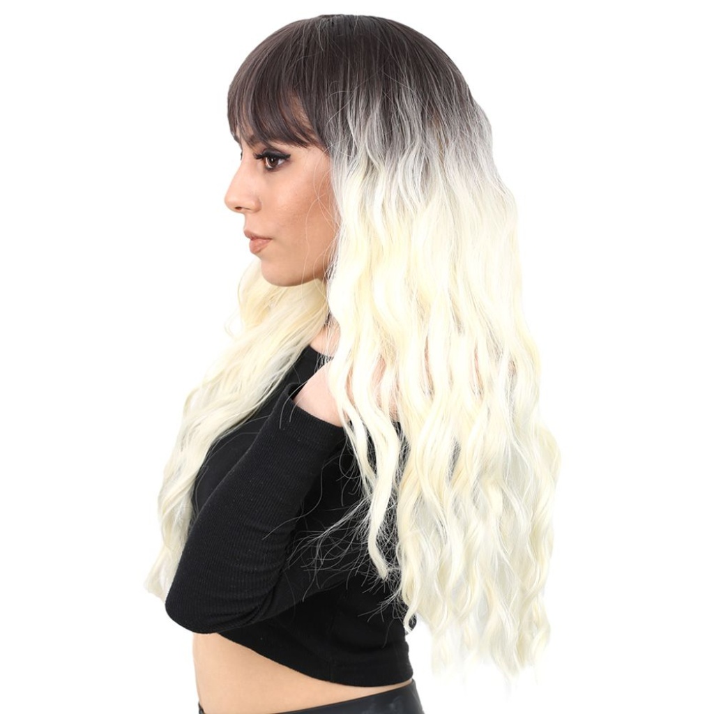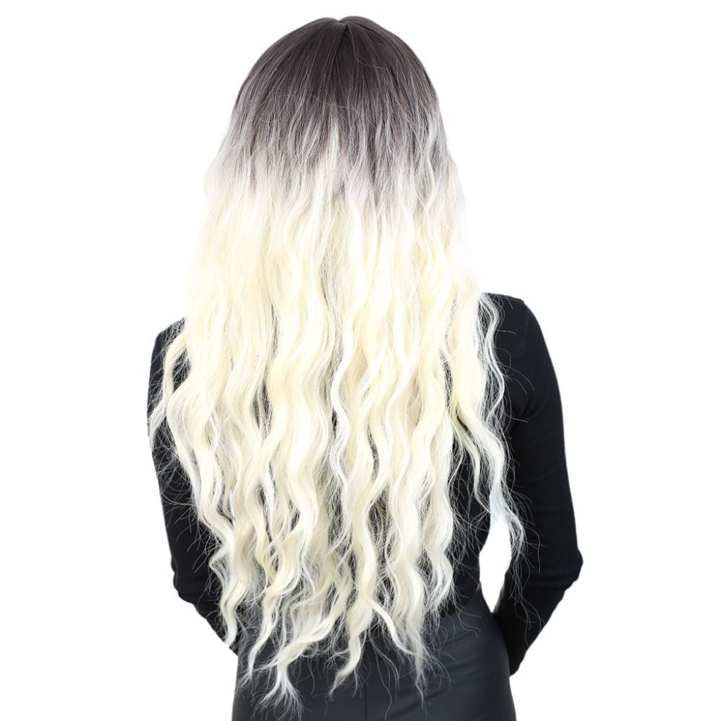 Perçemli Uzun Su Dalgası Fiber Sentetik Peruk - Küllü Siyah / Platin Ombreli
