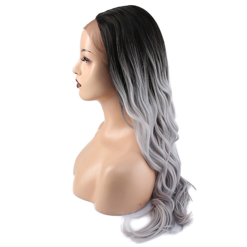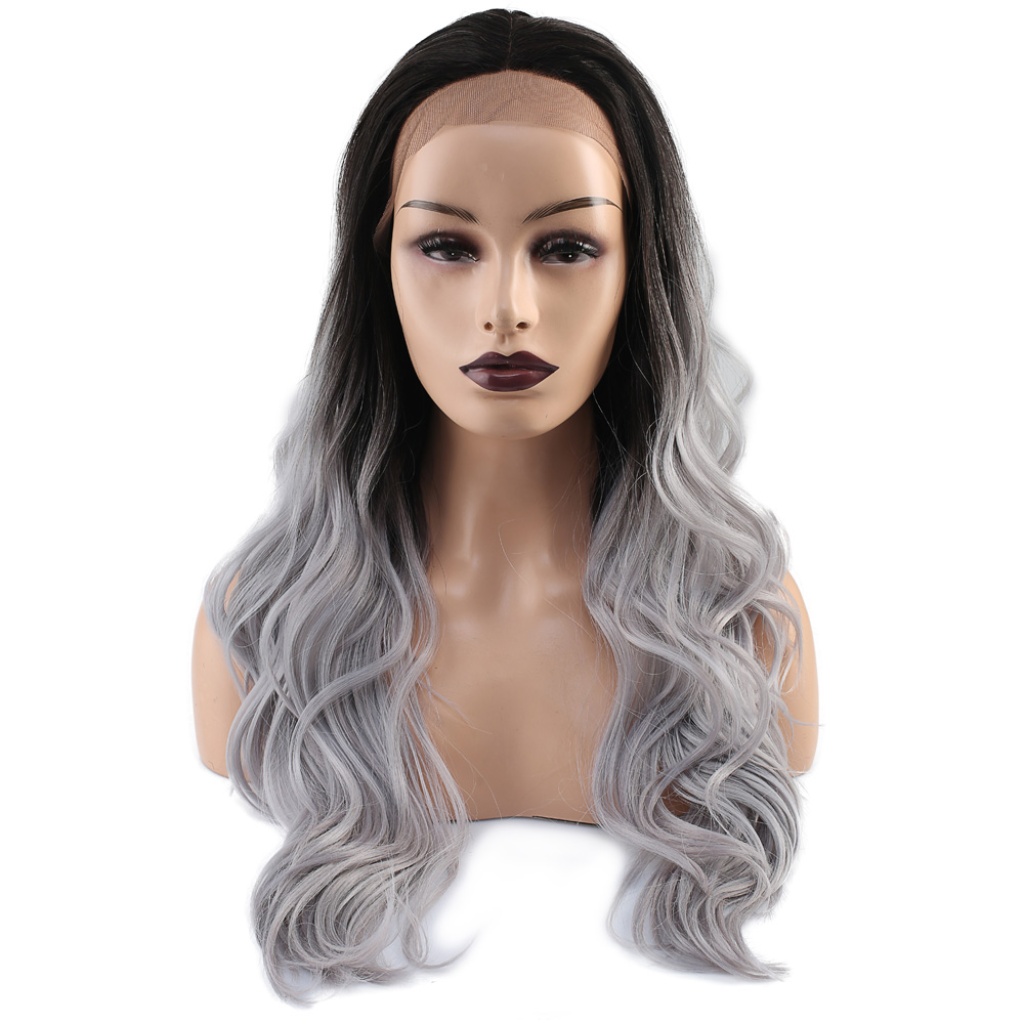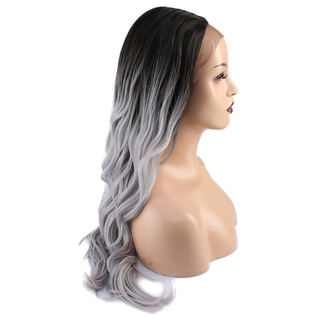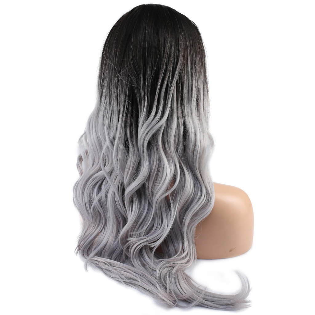 Su Dalgası Fiber Sentetik Tül Peruk - Siyah / Gri Ombreli