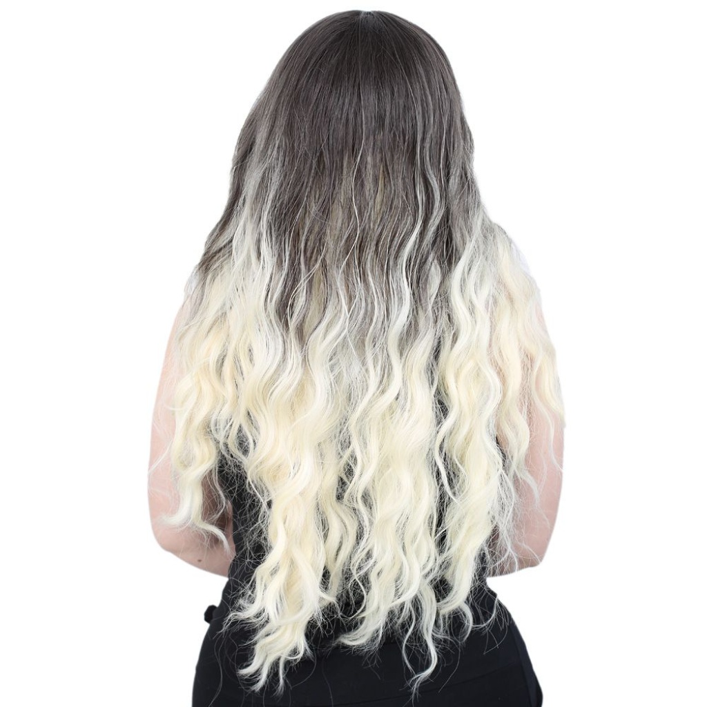 Su Dalgası Uzun Perçemsiz Fiber Sentetik Peruk - Küllü Siyah / Platin Ombreli