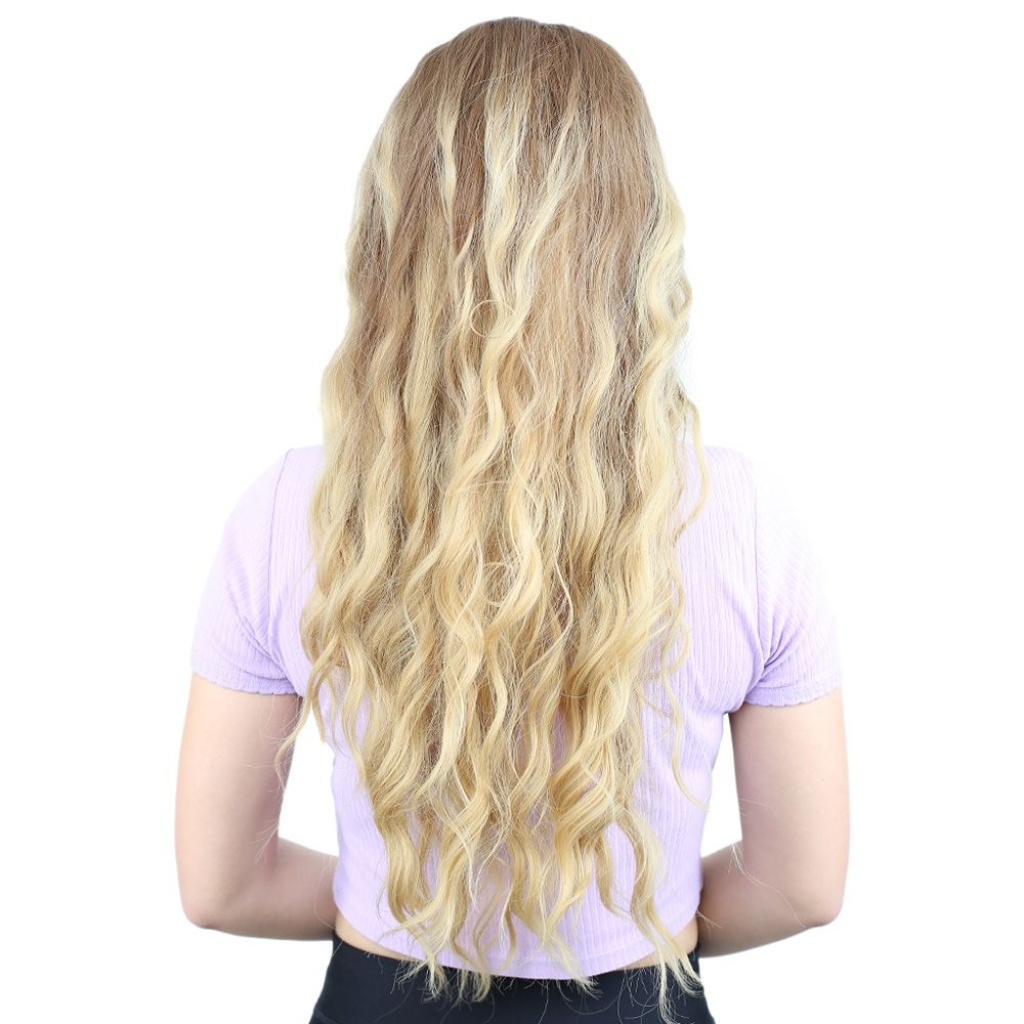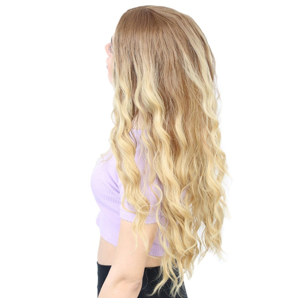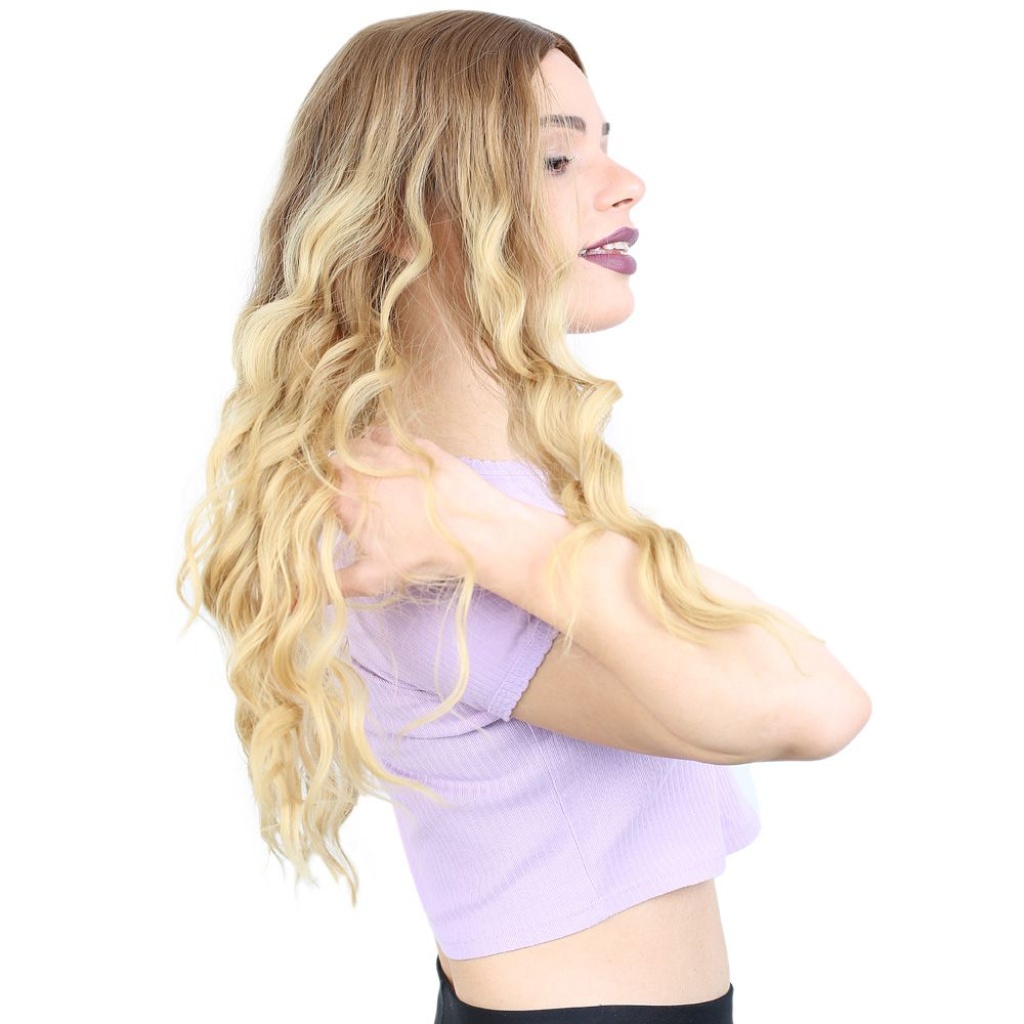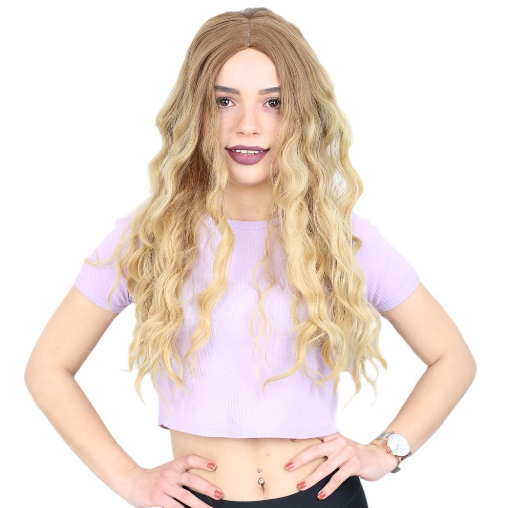 Su Dalgası Uzun Perçemsiz Fiber Sentetik Peruk - Kumral / Sarı Ombreli