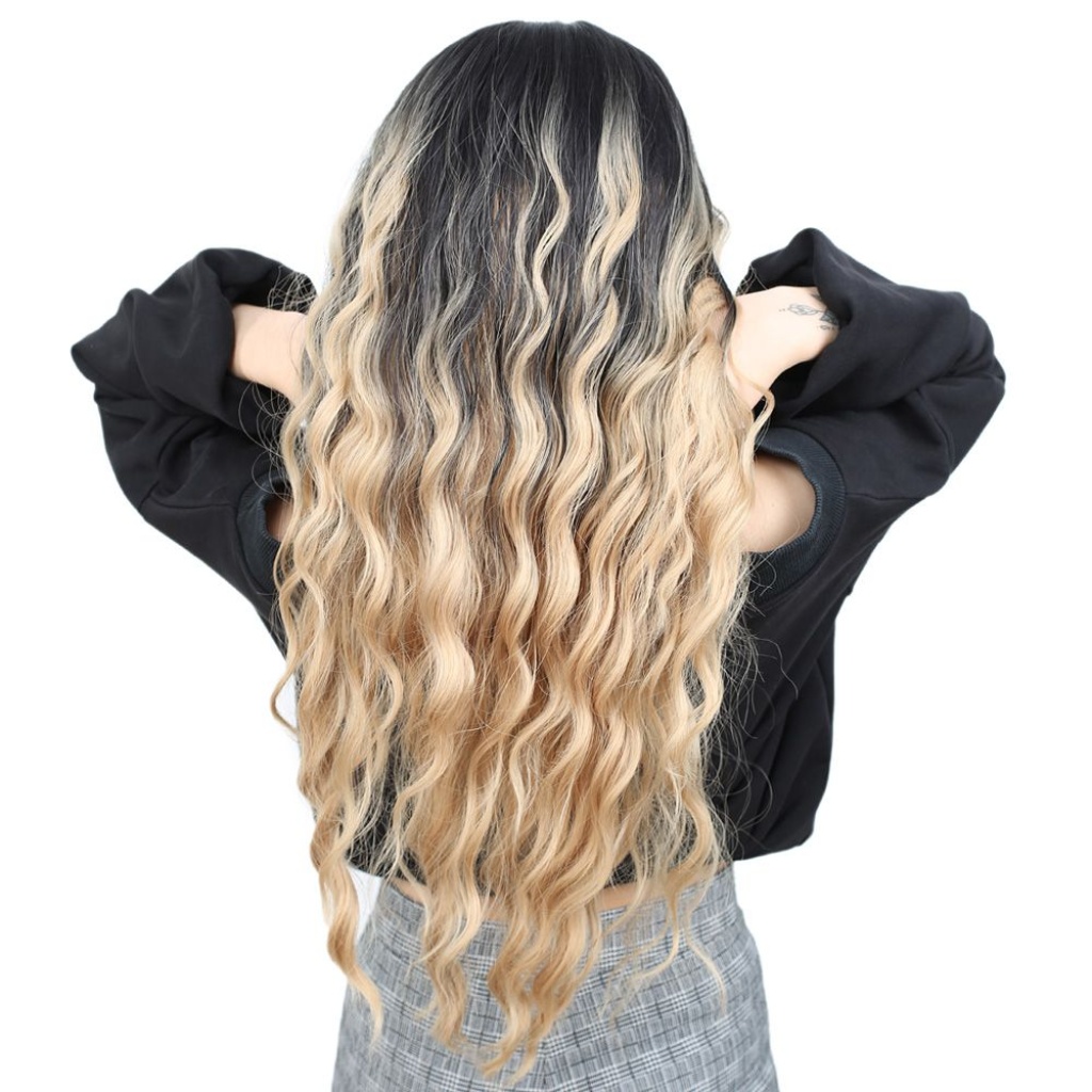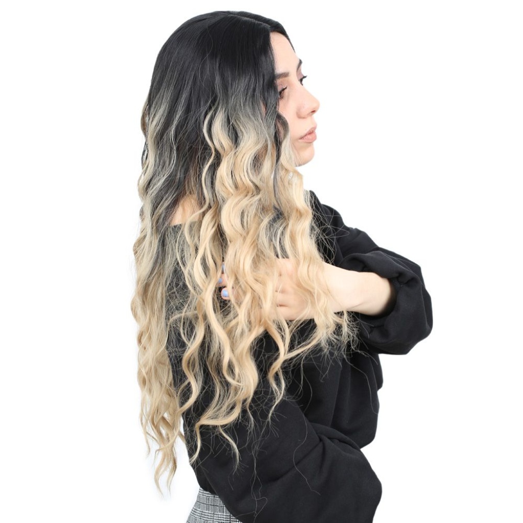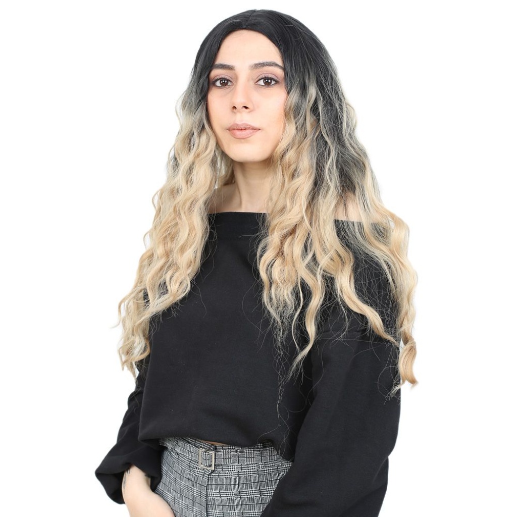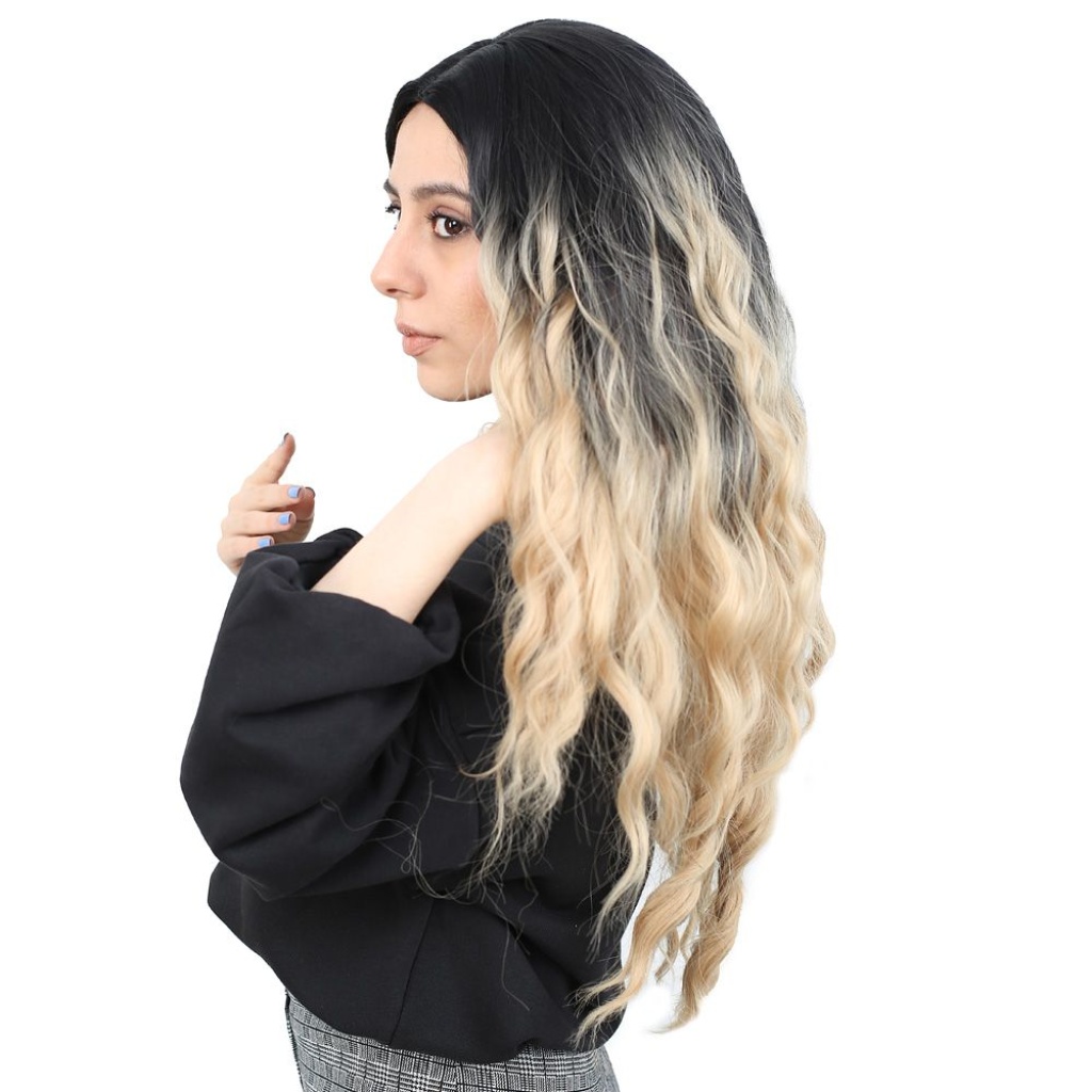 Su Dalgası Uzun Perçemsiz Fiber Sentetik Peruk - Siyah / Balköpüğü Ombreli