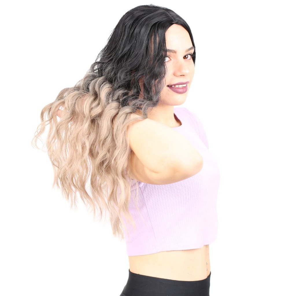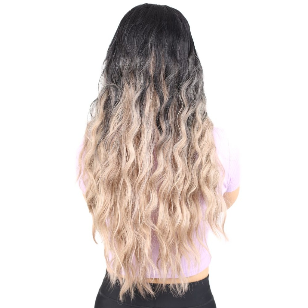 Su Dalgası Uzun Perçemsiz Fiber Sentetik Peruk - Siyah / Küllü Bebek Sarı Ombreli