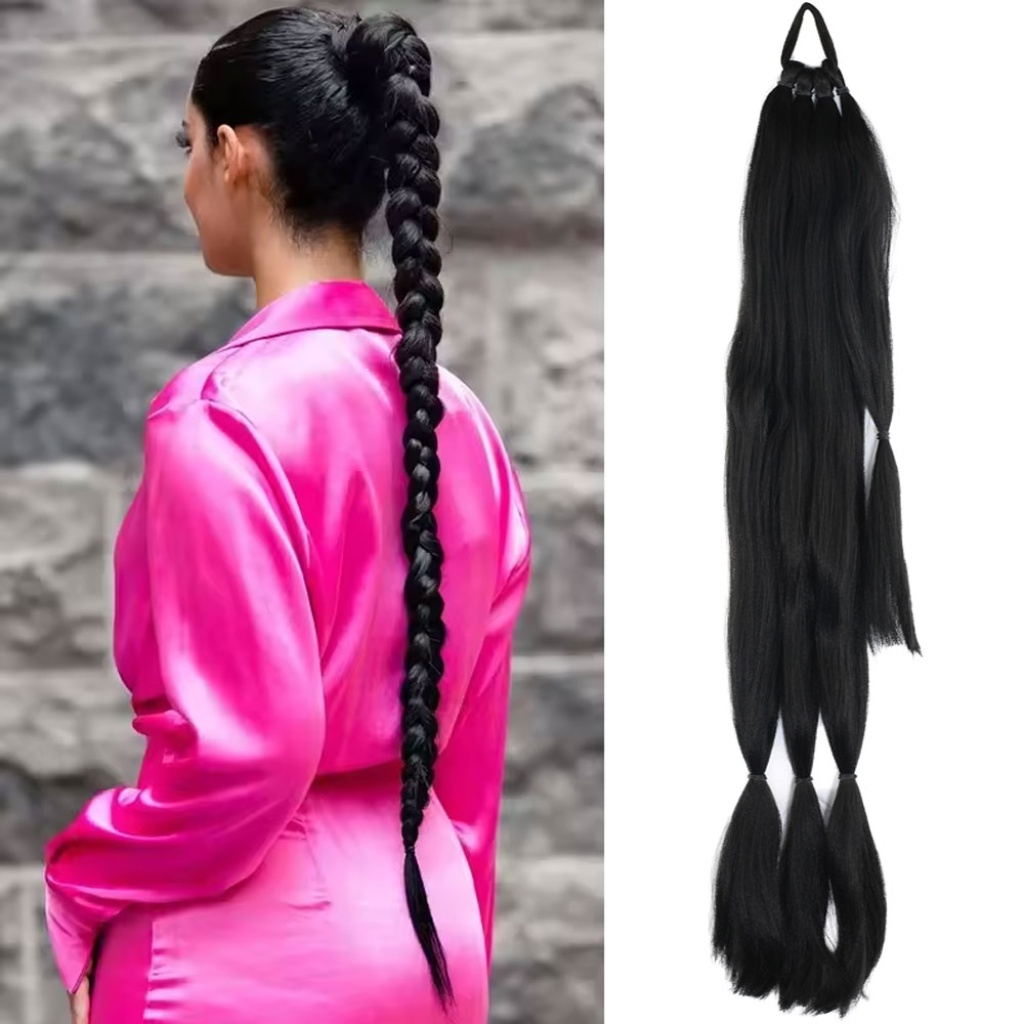 Üçlü Örgü Tokalı At Kuyruğu - Siyah