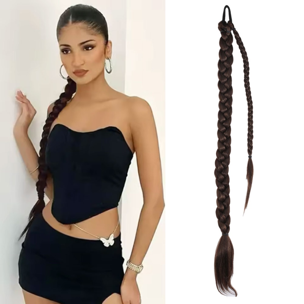 Üçlü Örgülü Tokalı Bağlamalı At Kuyruğu - Kahve Karamel