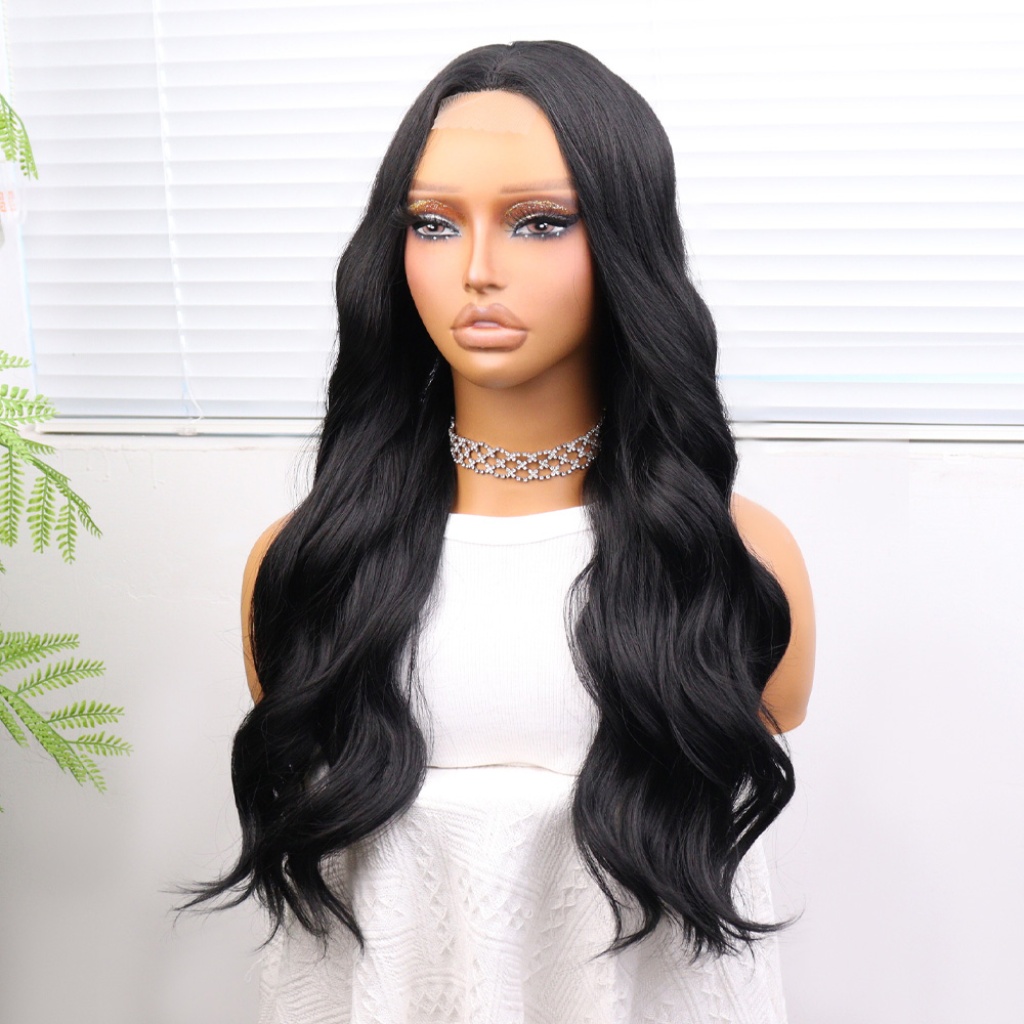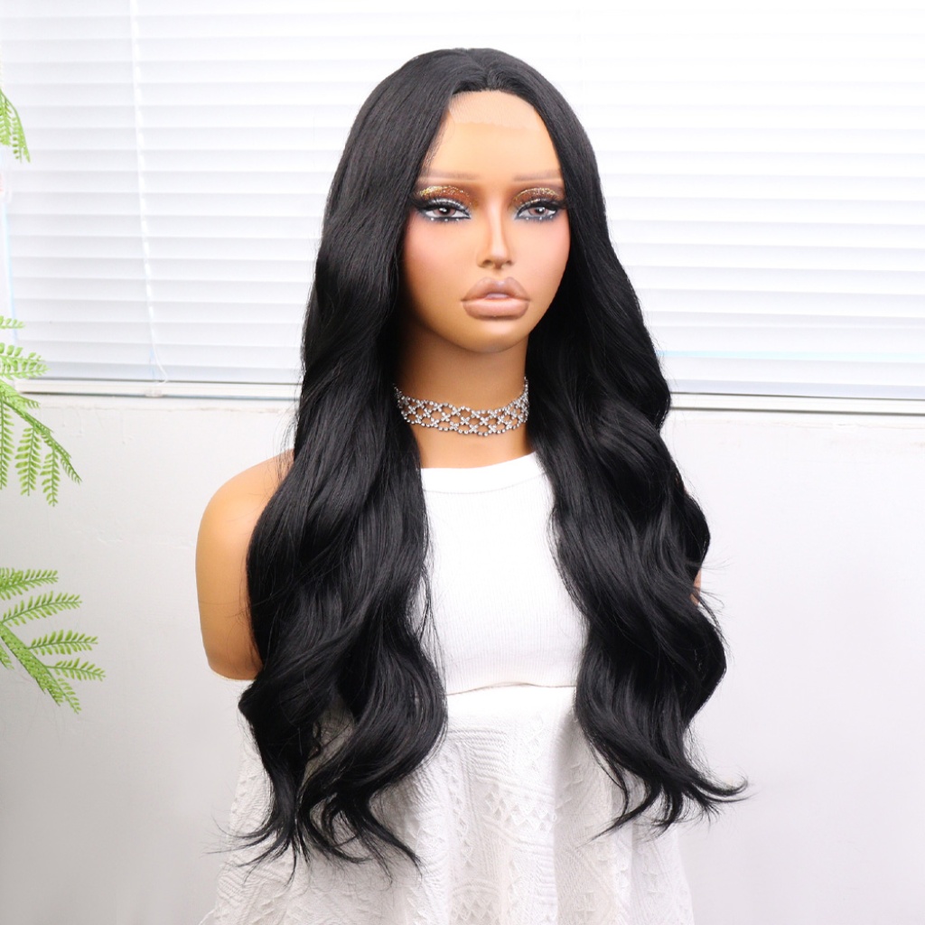 Uzun Siyah Su Dalgalı Fiber Sentetik Tül Peruk