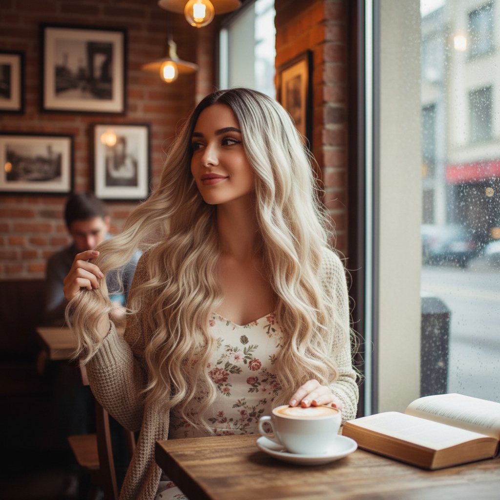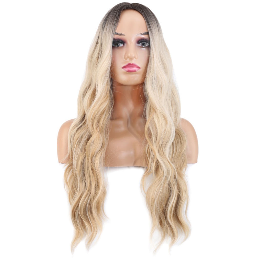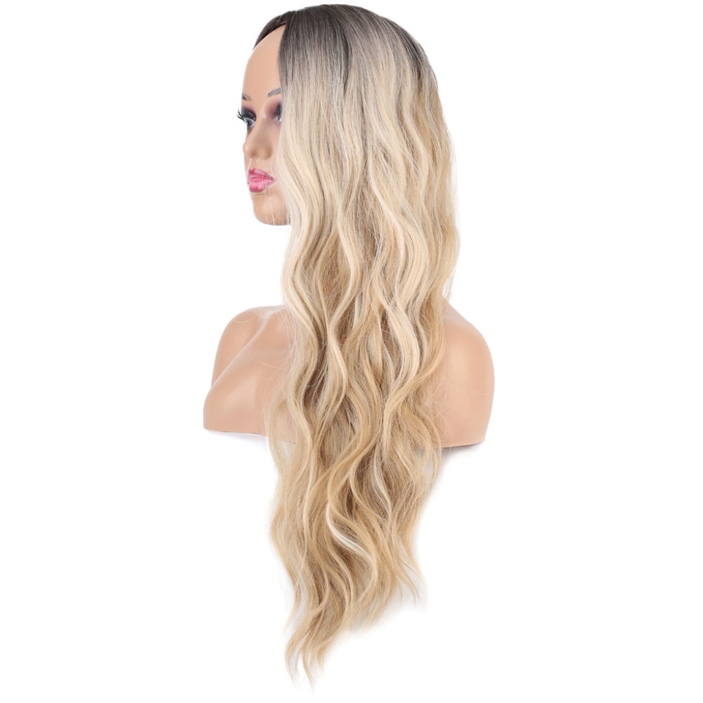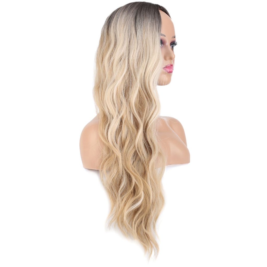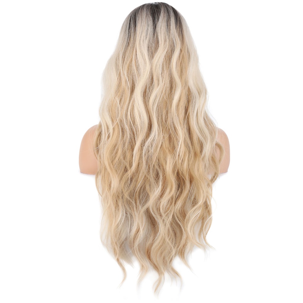 Uzun Su Dalgası Fiber Sentetik Peruk - Kumral / Bal Köpüğü Ombre ve Platin Röfleli