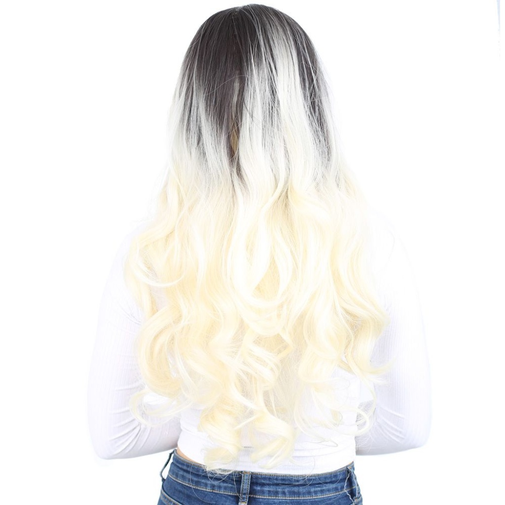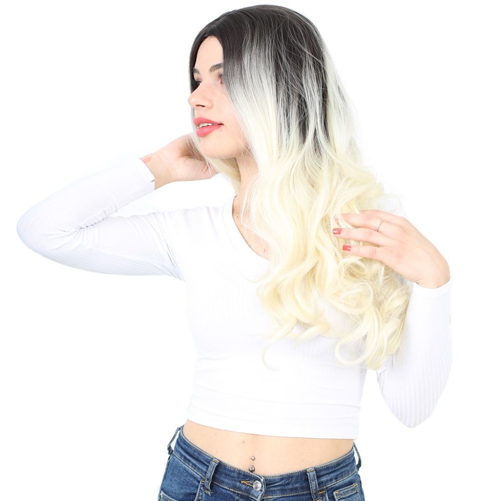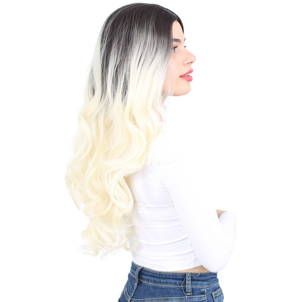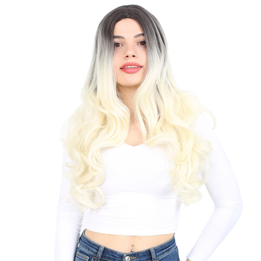 Yoğun Dalgalı Fiber Sentetik Uzun Perçemsiz Peruk - Küllü Siyah / Platin Ombreli