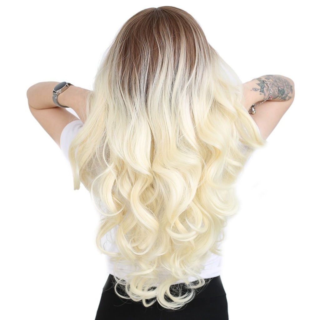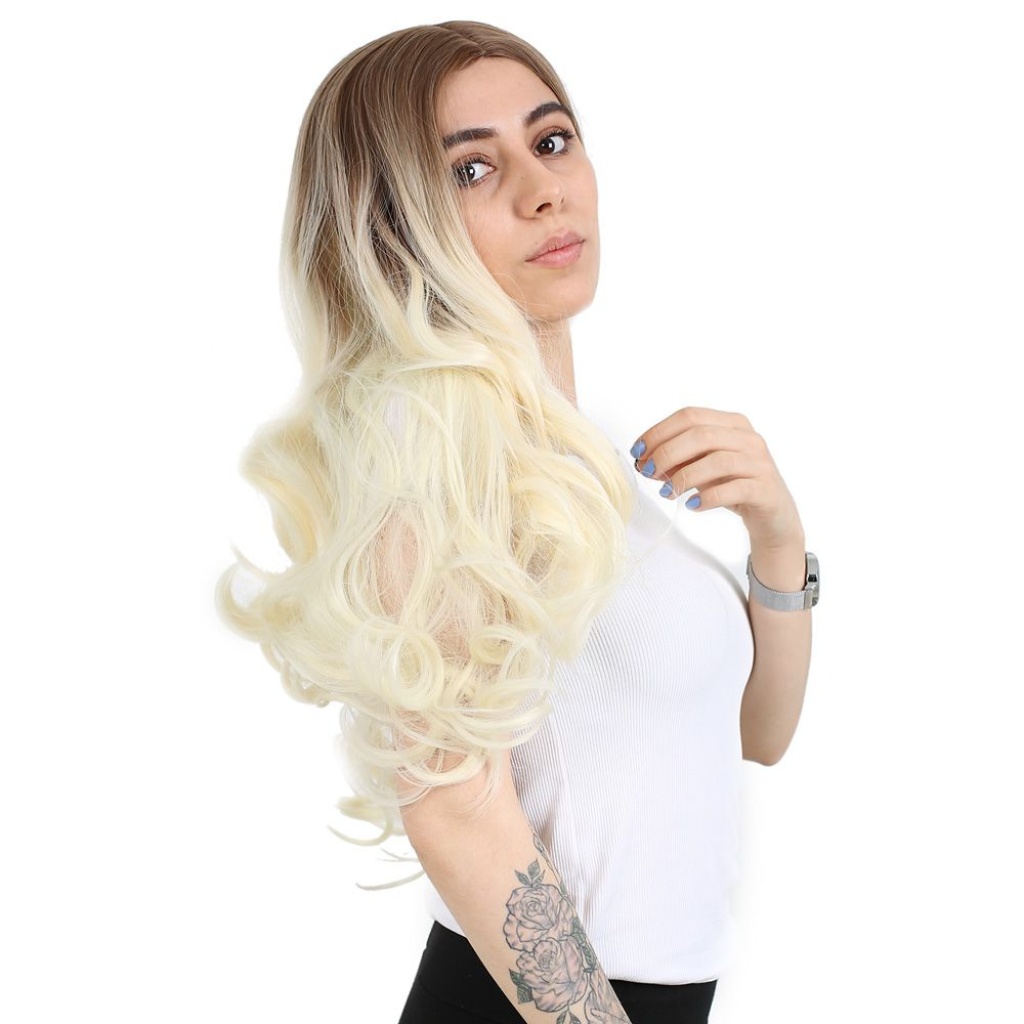 Yoğun Dalgalı Fiber Sentetik Uzun Perçemsiz Peruk - Kumral / Platin Ombreli